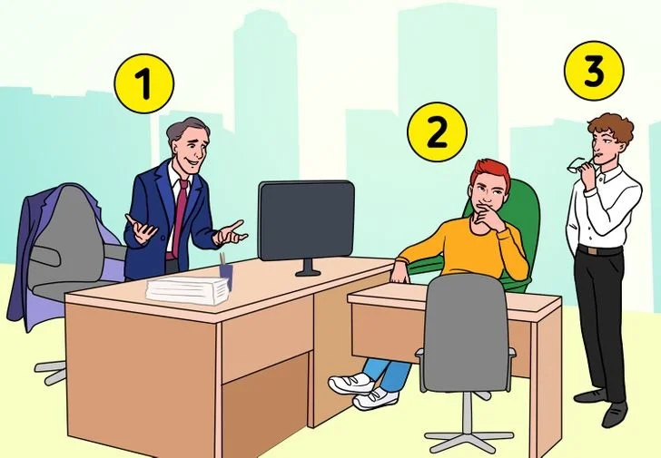 Пиджак человека №3 висит на кресле, поэтому это его кабинет. Пиджак вряд ли принадлежит человеку №2, поскольку он одет в джемпер. А человек №1 уже в пиджаке.