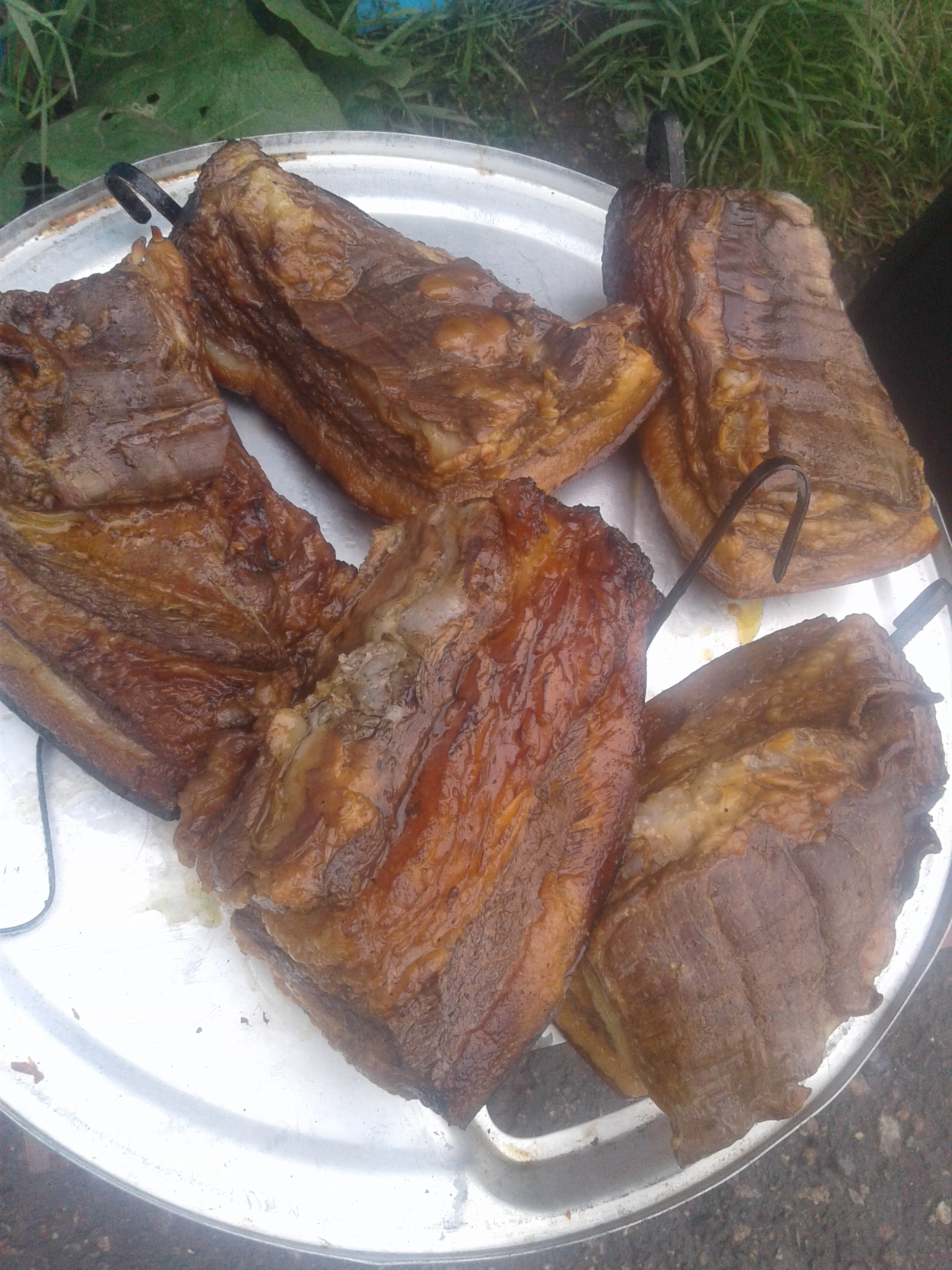 Далее, укладываем продукт и разводим под бачком костер. Дрова какие угодно, начиная от старых оконных рам, кончая обломками мебели. Регулировать огонь просто - дрова подкидывай. Сало с прослойкой замачиваю на ночь в круто соленом рассоле. Пачка на 3 литра воды. Избытки соли выйдут, когда от температуры сало начнет течь.