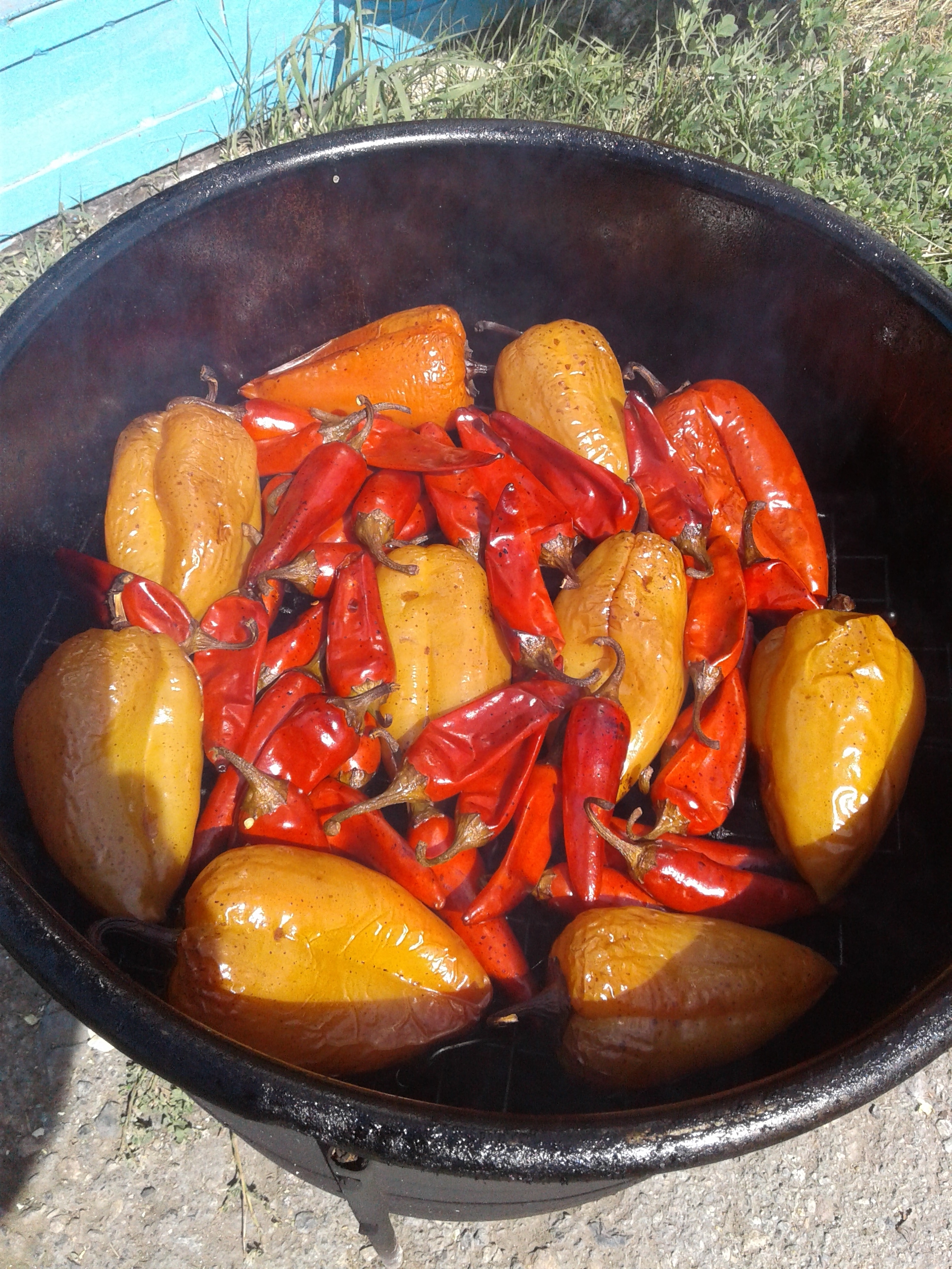 И поскольку экперементирую с созданием перцового соуса, то для большего выхода продукта засыпал в коптилку и перец болгарский пополам с чили.
