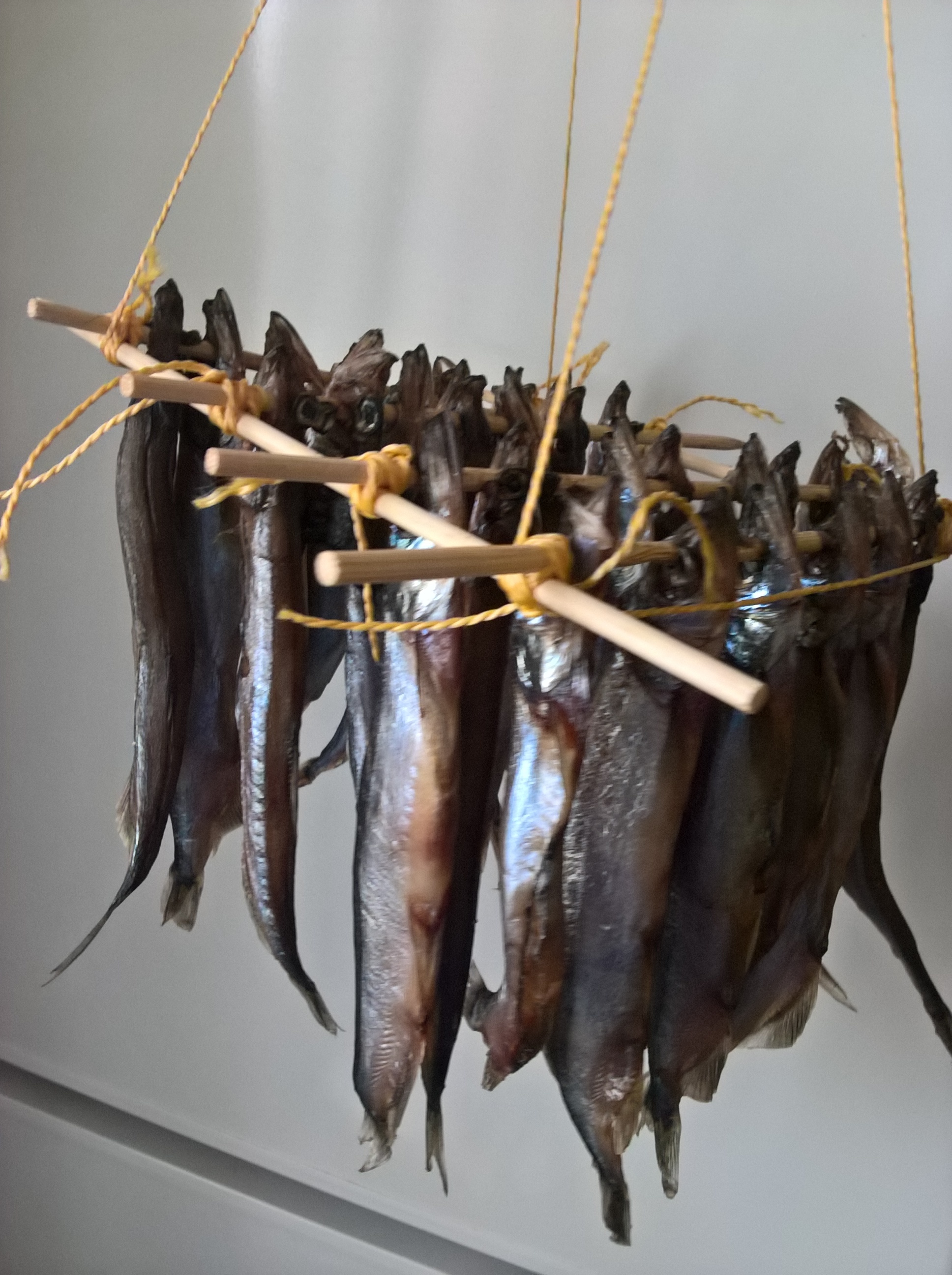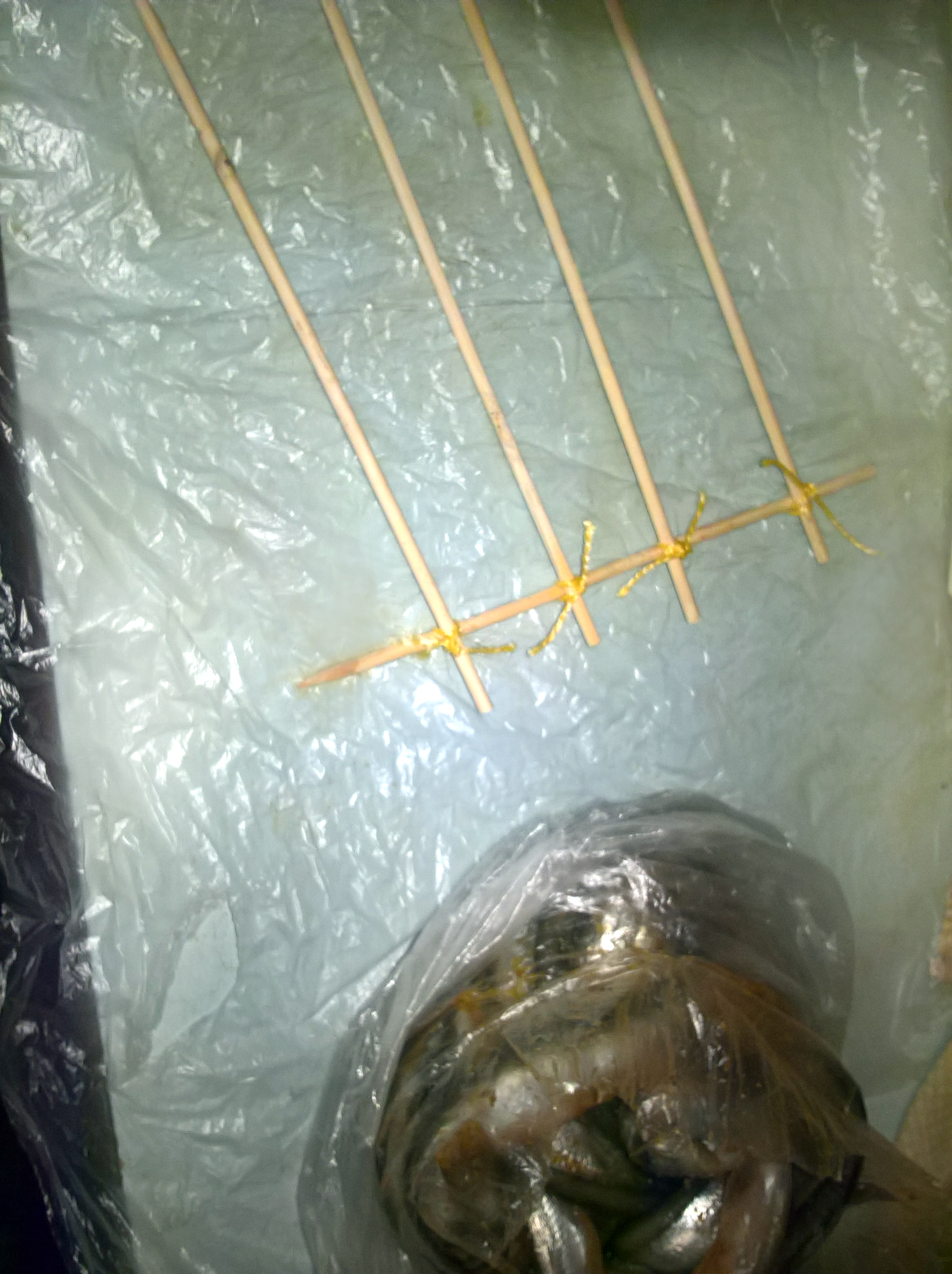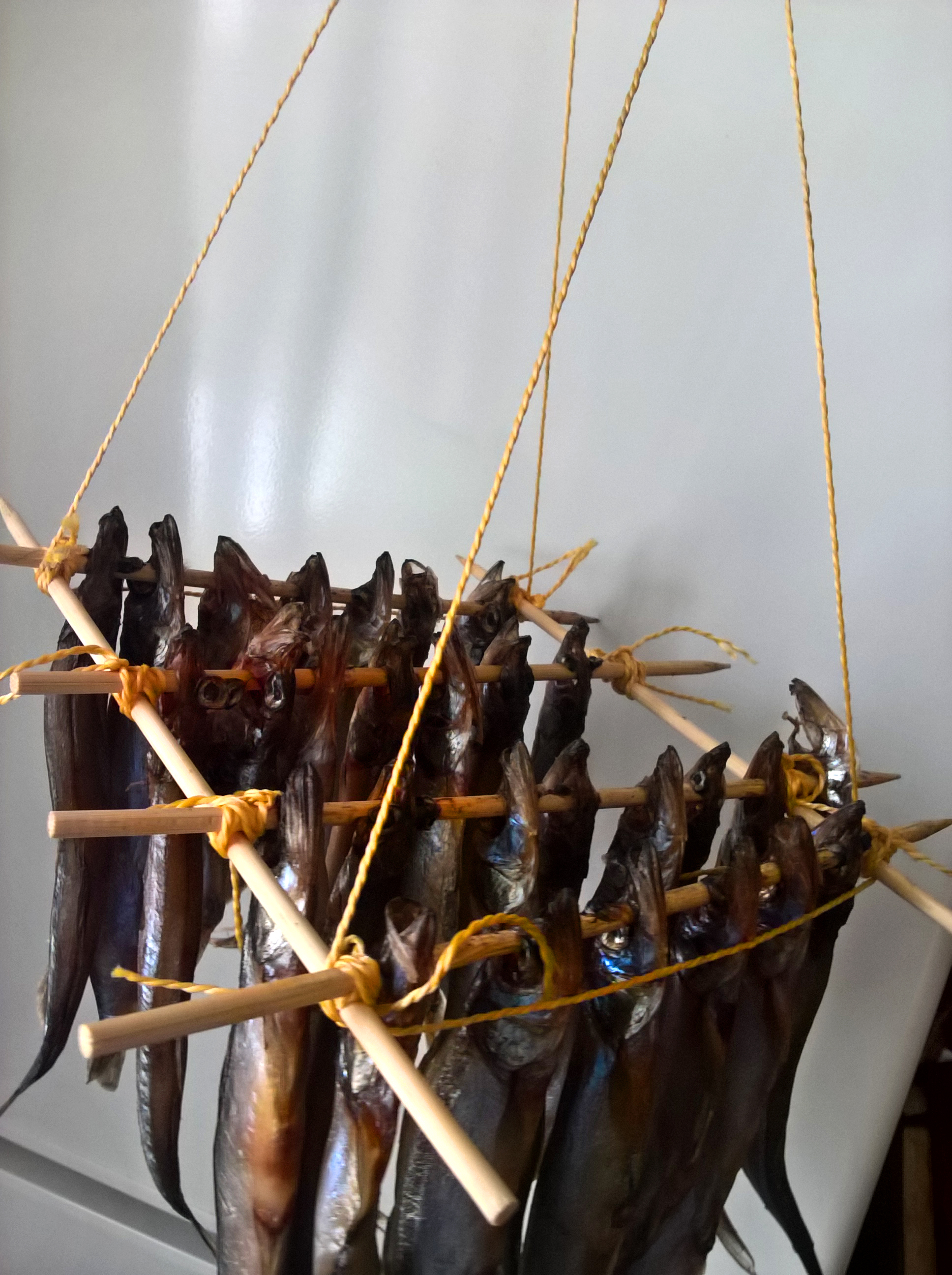 Придумала свою систему для вяления, из того, что скорее всего есть в каждом доме, -- нужны бамбуковые шпажки и катушка хозяйственных ниток. Собирается за 10 мин. прямо в процессе нанизывания рыбок.