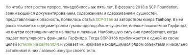 Но чтобы этот росток пророс, понадобилось аж пять лет. В феврале 2018 в SCP Foundation, занимающейся документированием, содержанием и сдерживанием сущностей, представляющих опасность, появилась статья SCP-3166 за авторством юзера Tanhony. В ней рассказывается о двухметровом гуманоидоподобном существе, внешне похожим на Гарфилда, но внутри состоящим чисто из пасты и лазаньи. Наибольшую силу оно приобретает, когда падает популярность франшизы Гарфилда. Тогда SCP-3166 приближается к одной из своих целей (список на сайте SCP) и убивает их, избивая находящимися рядом объектами и насильно заталкивая в них лазанью изнутри своего тела.