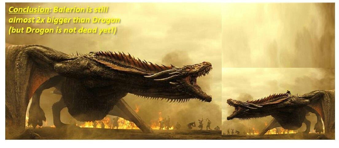 Дрогон всего в 2 раза меньше Балериона Черного УжасаА где об этом говорится? Я просто помню строки о Балерионе, что "Он был настолько велик, что тень от него могла накрыть целый город", а Дрогон и близко не таков.