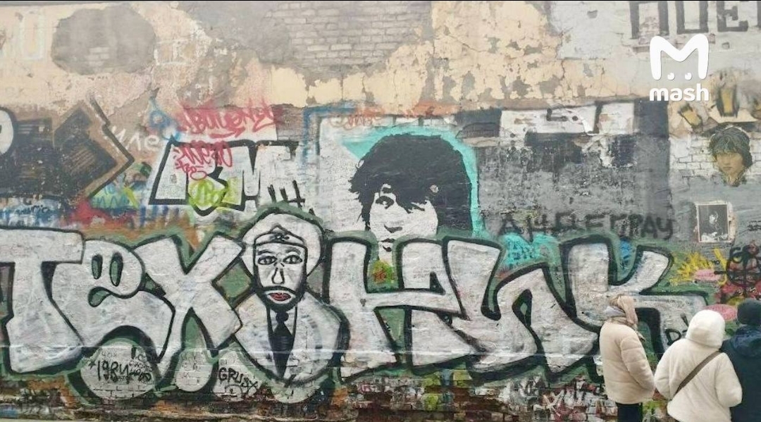 На видео с места происшествия видно, что граффити с лицом Цоя перекрывает большая надпись «Техник». Она занимает половину стены.