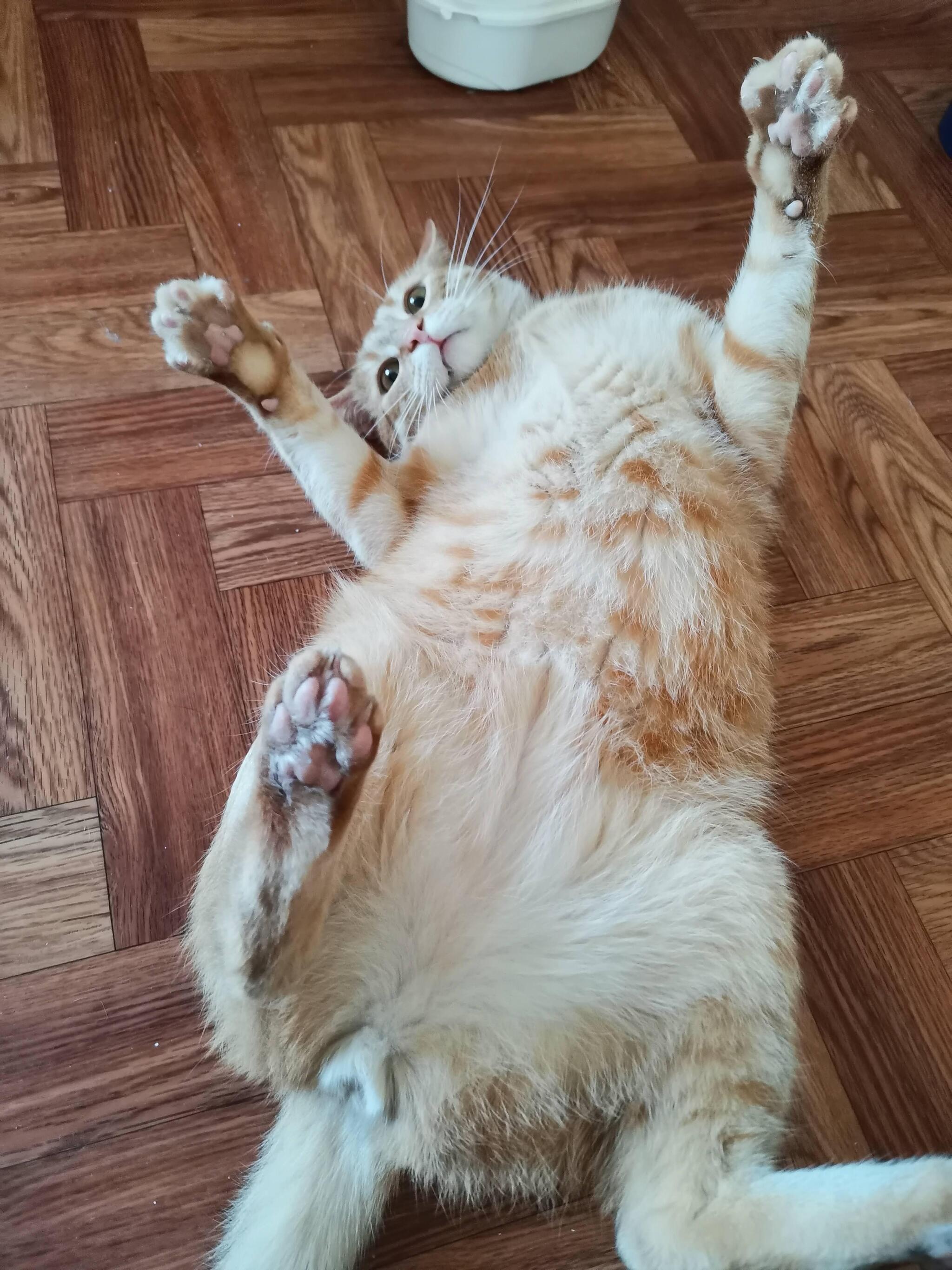 Он просто крупный. Я даже не знаю, откуда он. В смысле, до нас. Когда мы его взяли от дамы, которой весь частный сектор в нашем тогдашнем районе, сколько себя помню, котят и щенят подбрасывал на раздачу (как сказал ветеринар, уж лучше бы с улицы, чем оттуда), мы повели отсчёт возраст с момента, как поменялись зубы. Значит, ему было где-то 2-2.5 месяца, а выглядел крупнее. И я прям мечтала, чтобы он вырос большущим. И вырос) правда, хотелось бы ещё больше, чтоб в его пузяке утонуть можно было, такое кайфовое)