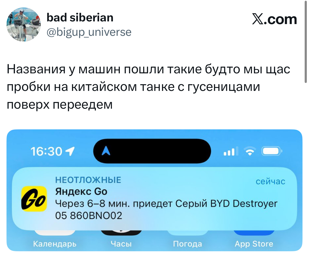 19 v.mixajloff Серия #ИксТвиттерские Просто хочу доехать до "Пятёрочки", а не устраивать зачистку 24 дня назад Юмор Скриншот X (Twitter) Китайские авто Название Яндекс Такси Ещё 0