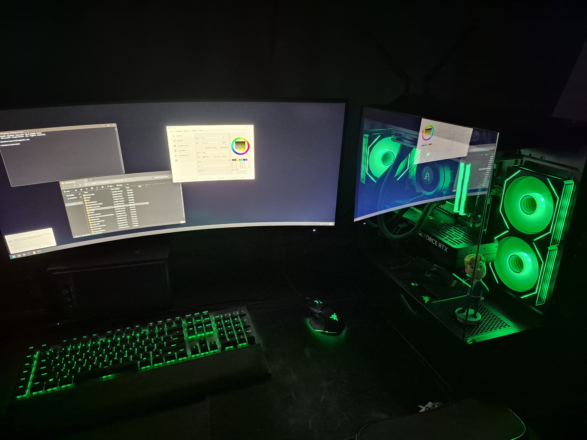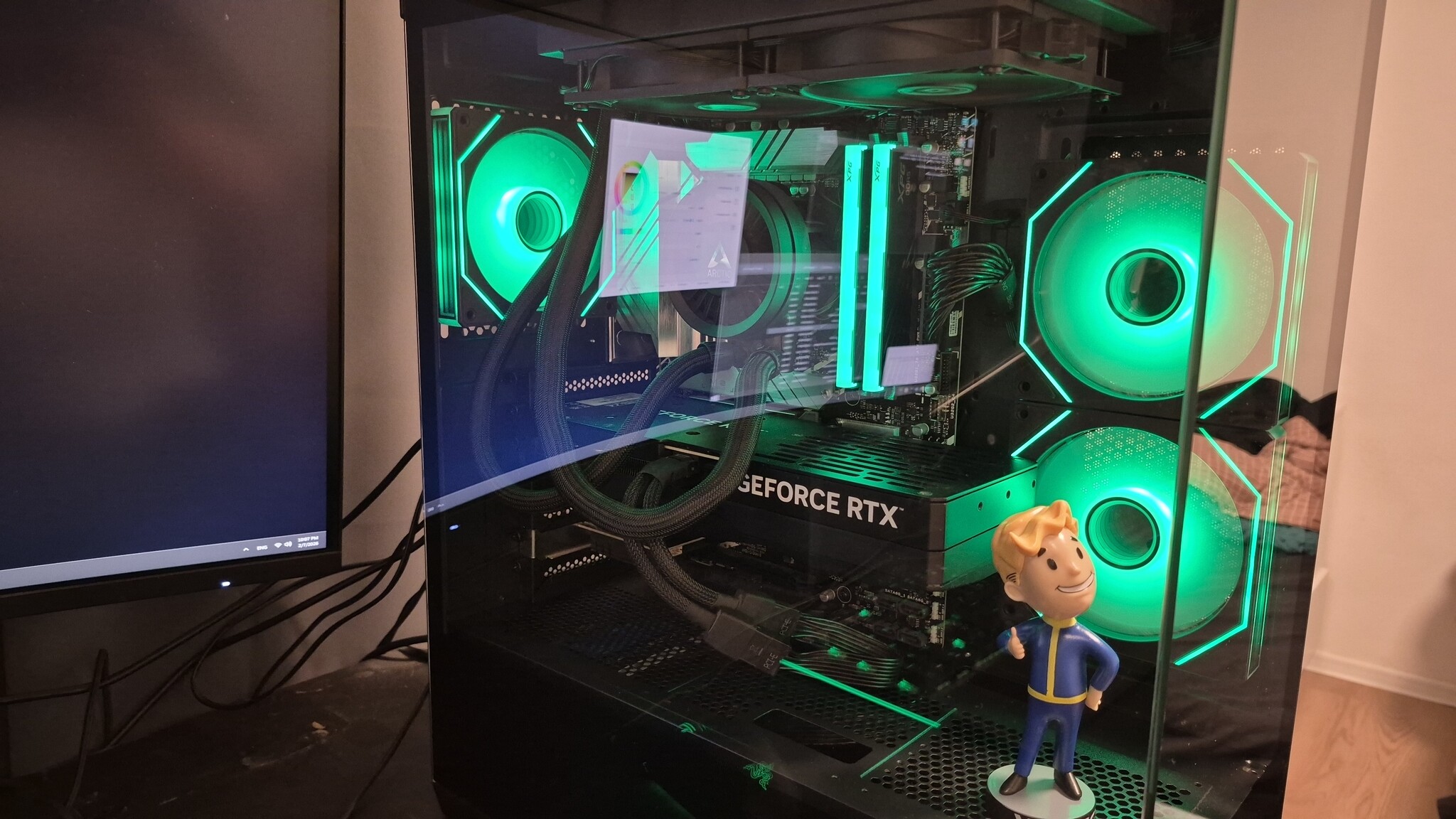 Собрал себе ПК, в первый раз собираю в корпусе "аквариум", в первый раз разобрался полностью с подсветкой, жена ещё подарила фигурку Vault Boy и дала идею для общей темы:)