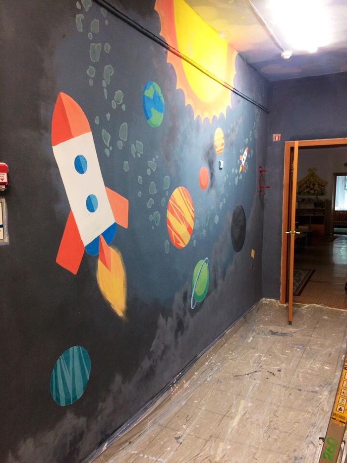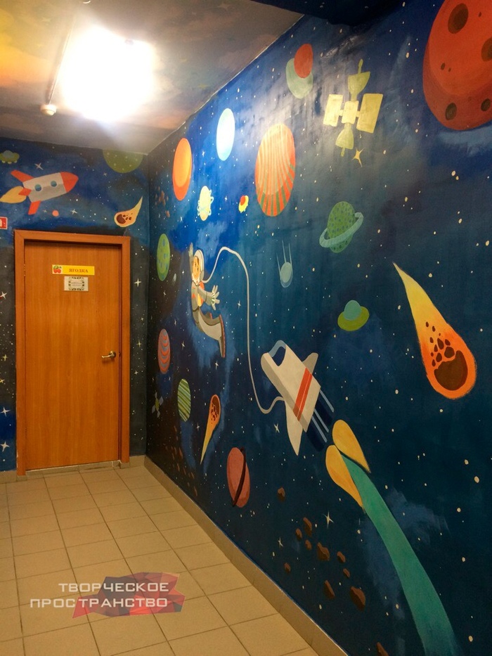 Недавно собрались несколько новосибирских чуваков и решили, что рисовать на стенах -- это круто. Эти чуваки -- мы, "TUNDRA", и вот одна из наших первых работ, космос в детском саду. Делюсь процессом, опытом и ошибками.