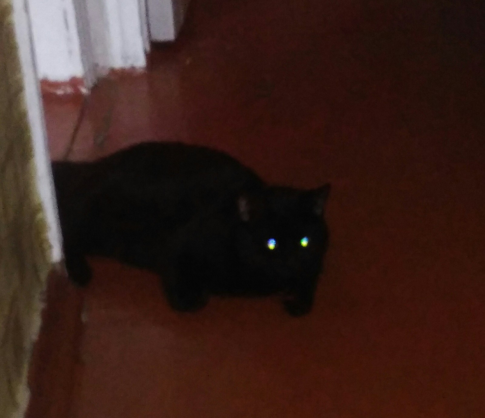 Чёрный кот да с красными глазами. А они в темноте у него светятся?