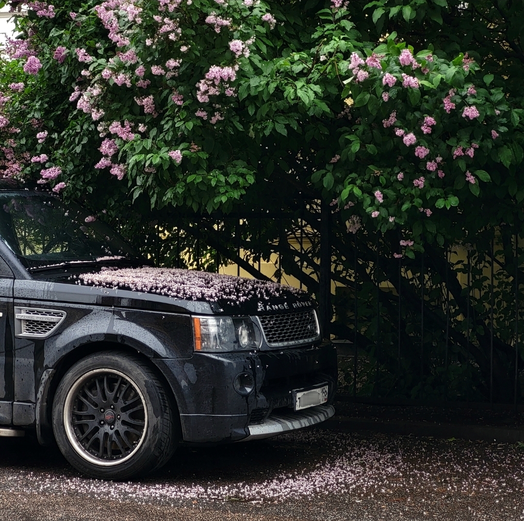 Без негатива, без политики и тд. Просто капот чёрного Range после дождя, покрытый соцветиями фиолетовой сирени.