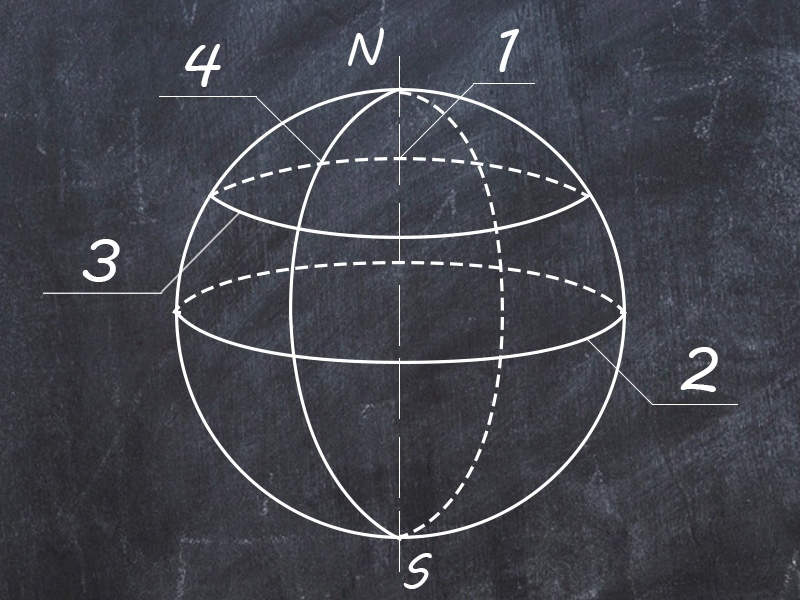 Экватор — окружность большого круга Земли (2), перпендикулярная земной оси. Экватор, как известно, делит планету на северное и южное полушария. Все окружности, параллельные плоскости экватора, называются параллелями (3).
