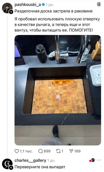 64 LenlionJENK Юмор Просто переверни 7 дней назад Открутить сифон наверно не догадался... Юмор Вопрос Разделочная доска Раковина 28 2 1 1 Ещё 0