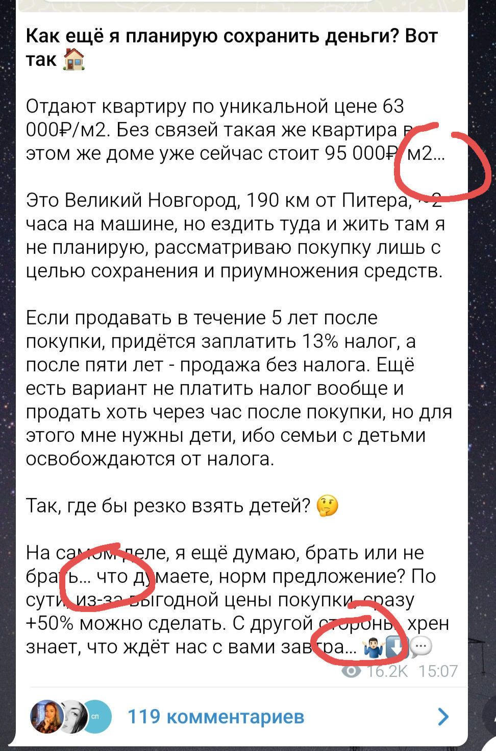 - Короче...я подписан в телеге на одного чувака. Молодой парень, занимается инвестициями. Судя по всему, при бабках. И кажется, душевный тип... И не жадный. Решил  к нему обратиться. Вдруг сможет помочь, хотя бы маленько, тысяч 20-30 на счет забросит.