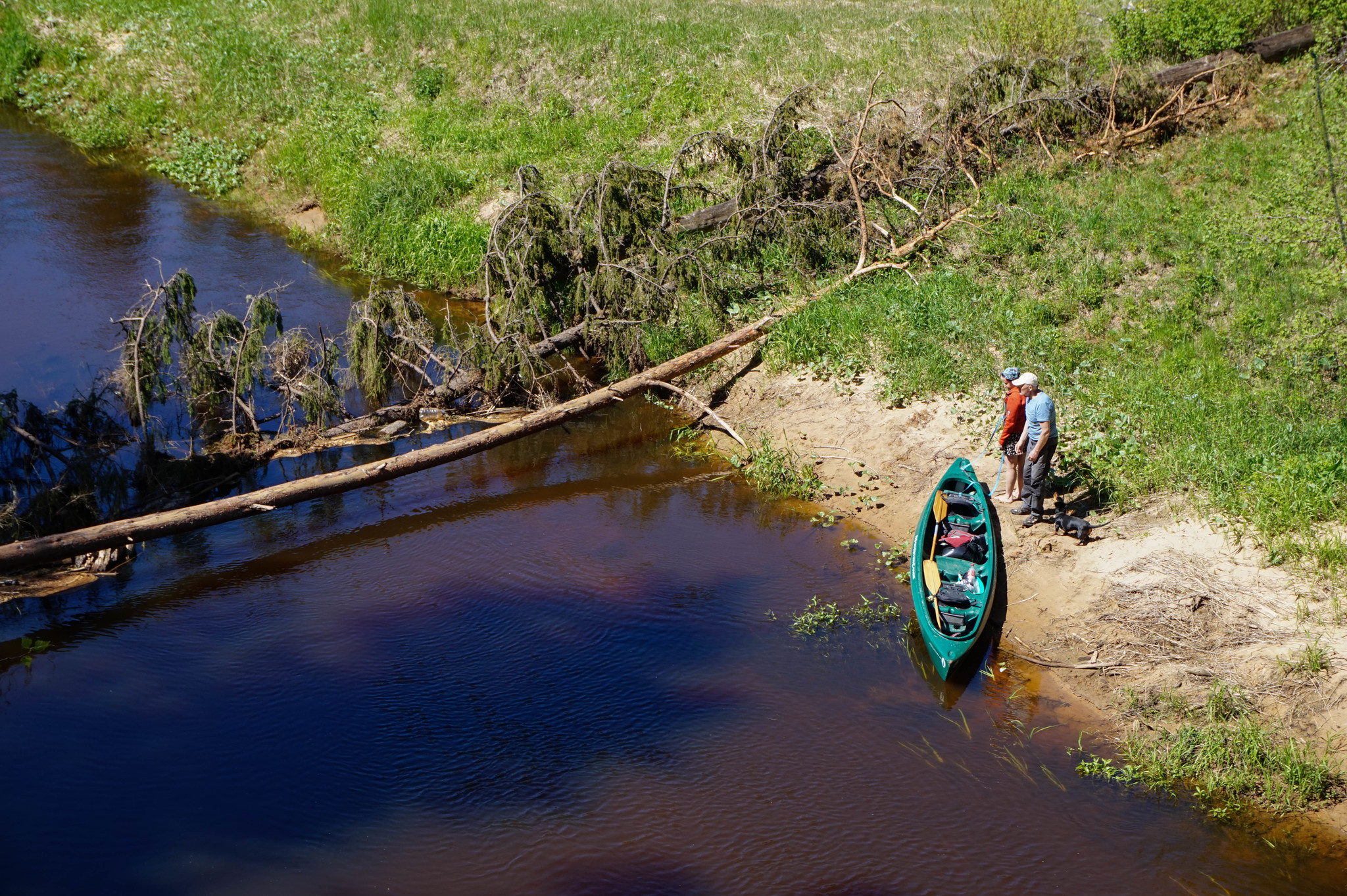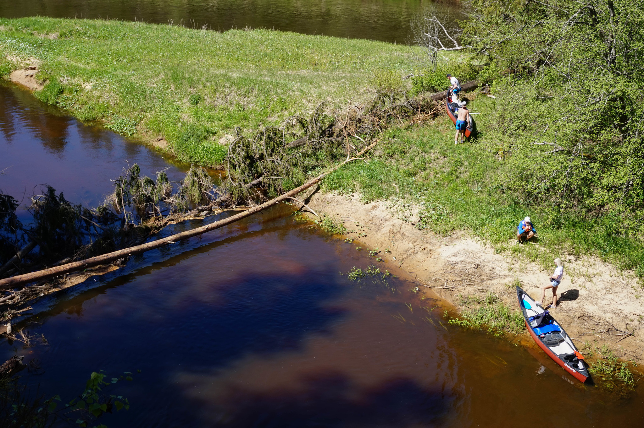 Река разделяется на два русла островком и на развилке не видно, что один из протоков перегорожен упавшими деревьями.