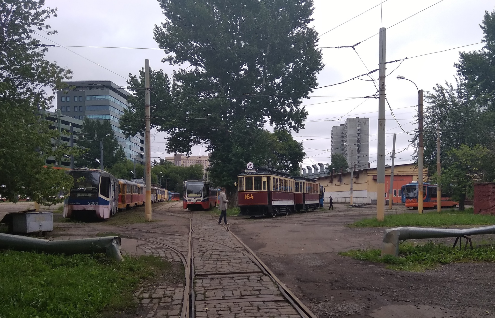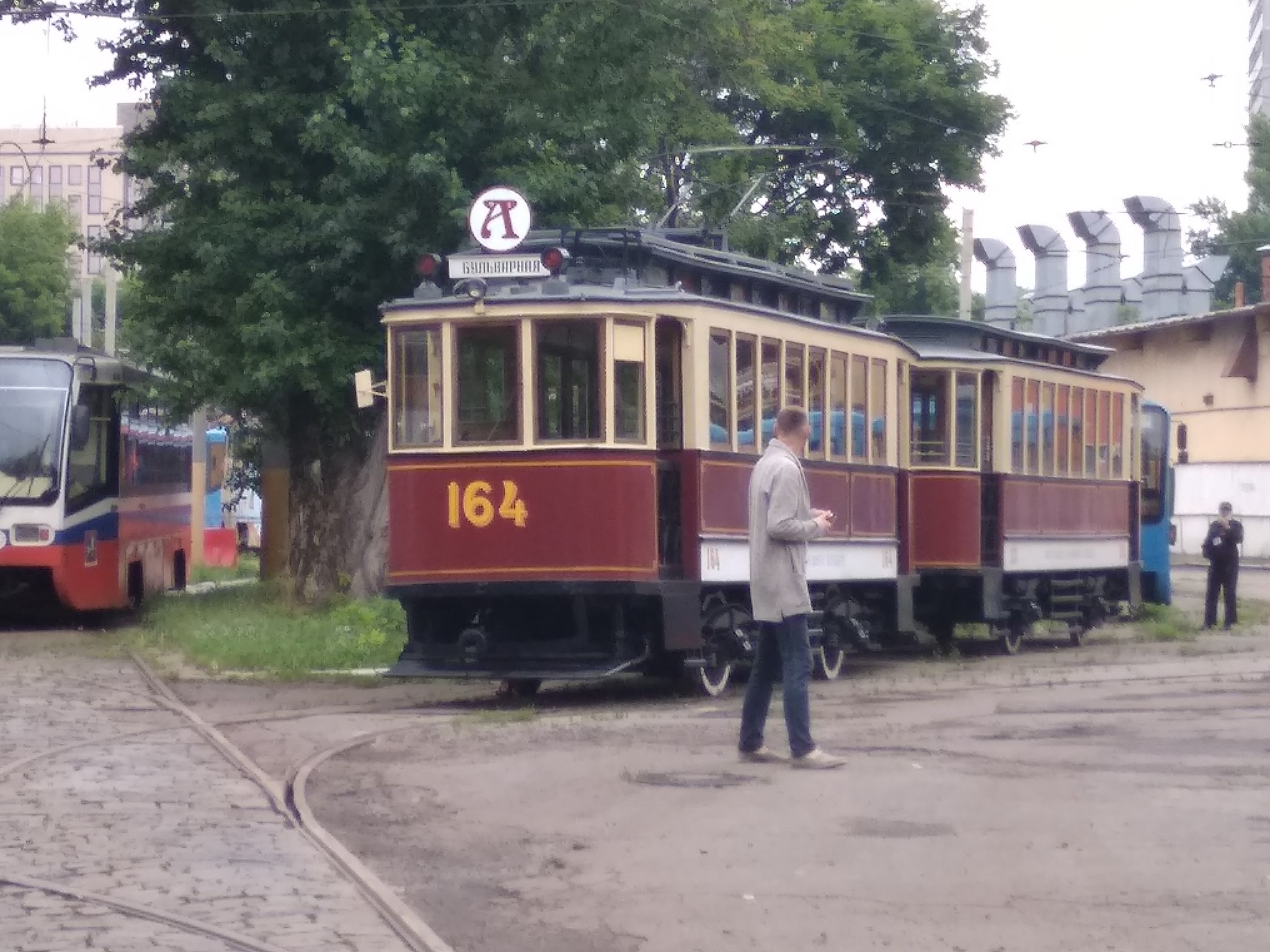 Трамвай № 164 построен в 1908 году. До 40-х годов использовался как пассажирский, позже был перестроен в грузовой. В 80-е годы восстановлен в первоначальном виде.