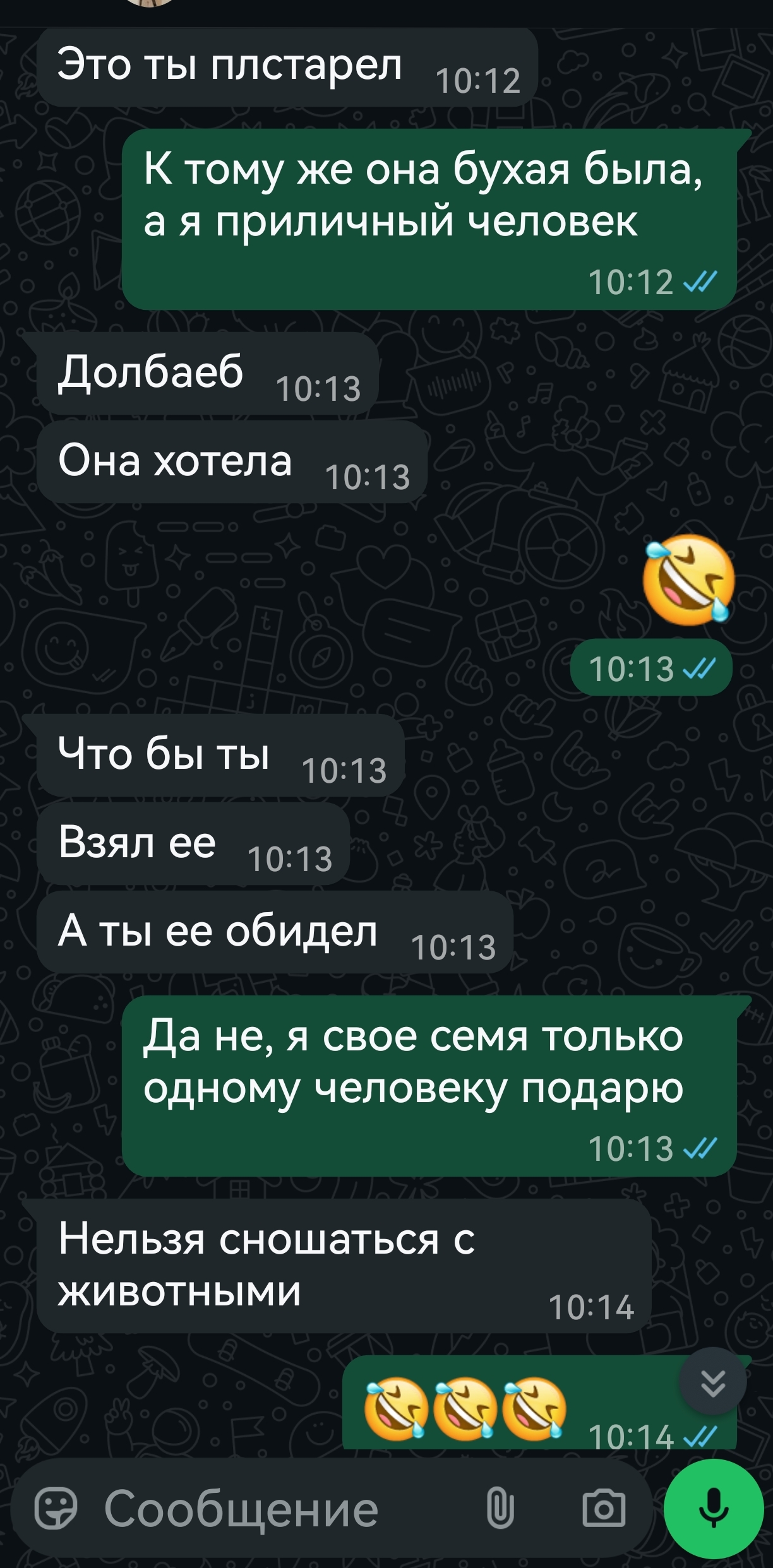 Dolbarik Просто с корешем с утра переписнулся... 2 дня назад [моё] Скриншот Сношение Друзья Обида Семя Мат 3 Ещё 0