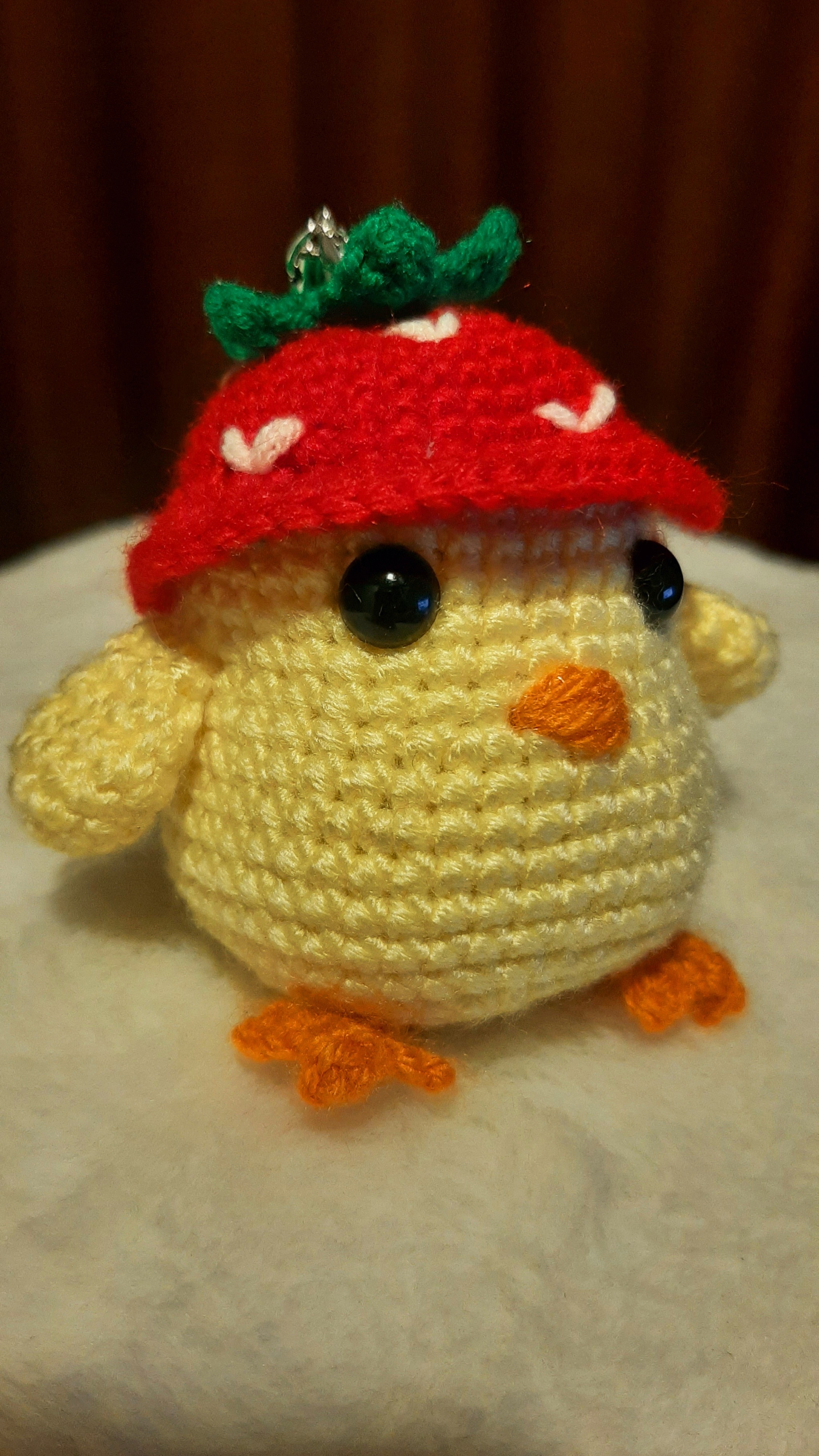 Это просто цыплёнок в шляпке-клубничке. Связала за один вечер. Как вам?