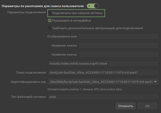 Выключаем "Параметры по умолчанию" и ставим галочку на "Подключать при запуске системы", жмем "ок".