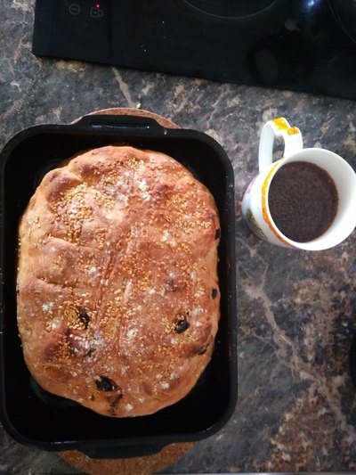 А еще из такого хлеба выходят классные гренки на завтрак (вы же помните, что там был сыр, да?). Я его жарю на сухой чугунной сковороде к утреннему кофе и это круто. Эти кисловатые помидоры и маслины в хлебе меня тоже приятно порадовали.