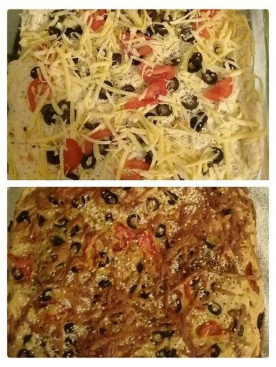 - Уже в форме тесто надсечь крест-накрест, вставить сверху нарезанные вяленые томаты, маслины и тимьян. Смазать растительным маслом и присыпать немного сыром. У меня был пармезан. Его тут нужно буквально ложка. Он хорошо держит температуру и не превращается в резину.