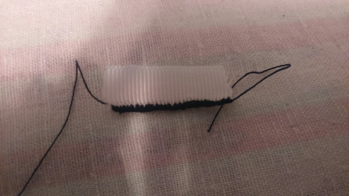 Это я попробовал сделать каптал на тесьме. Провязал ряд крючком в столбик без накида