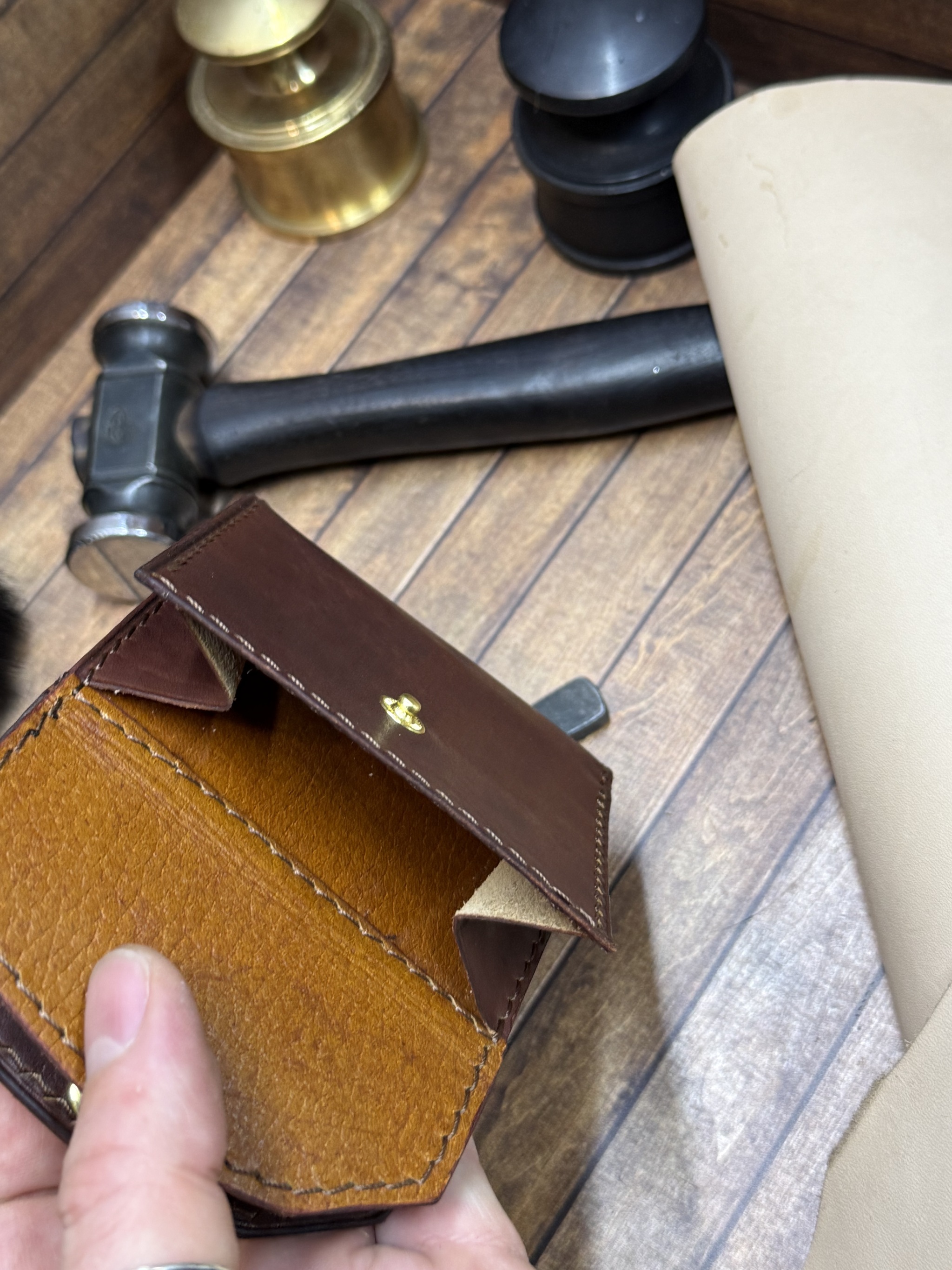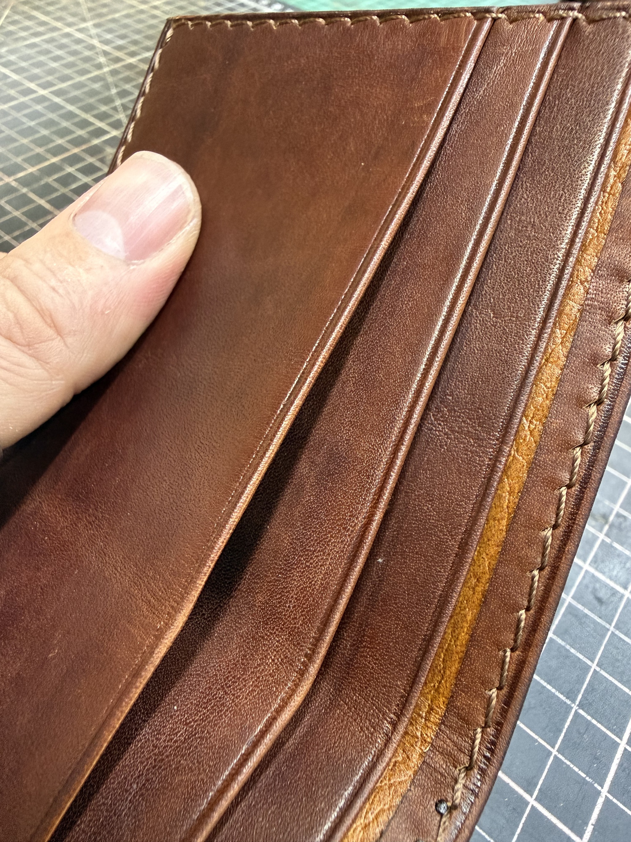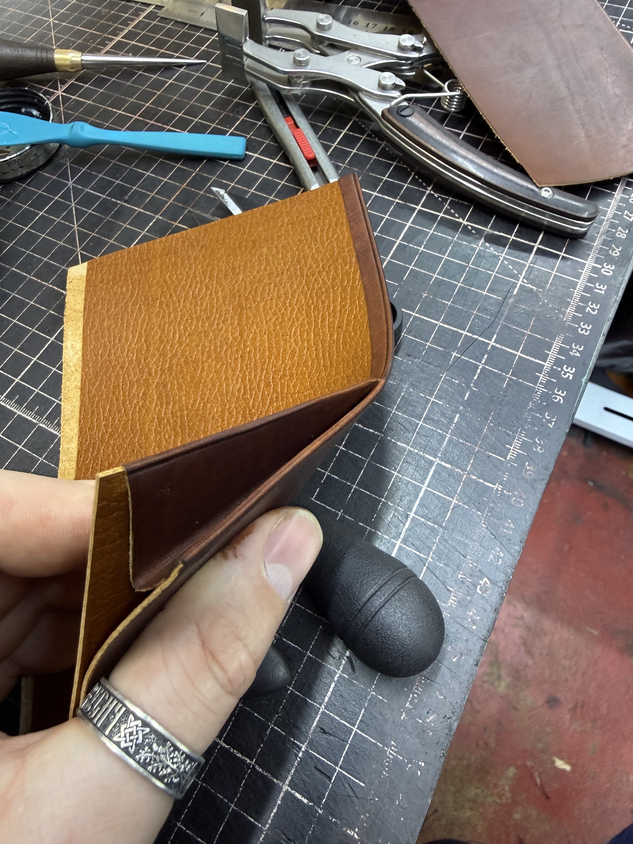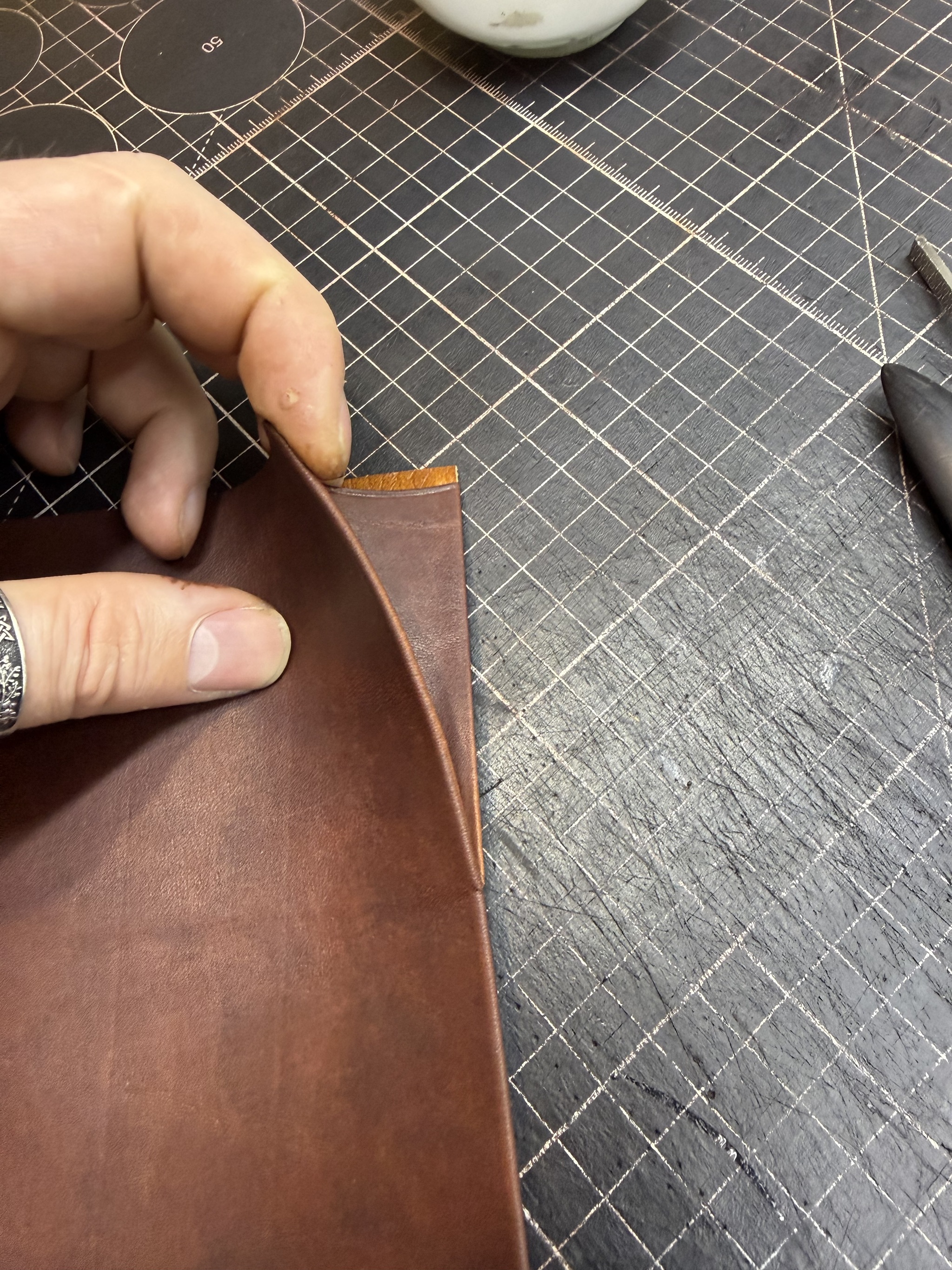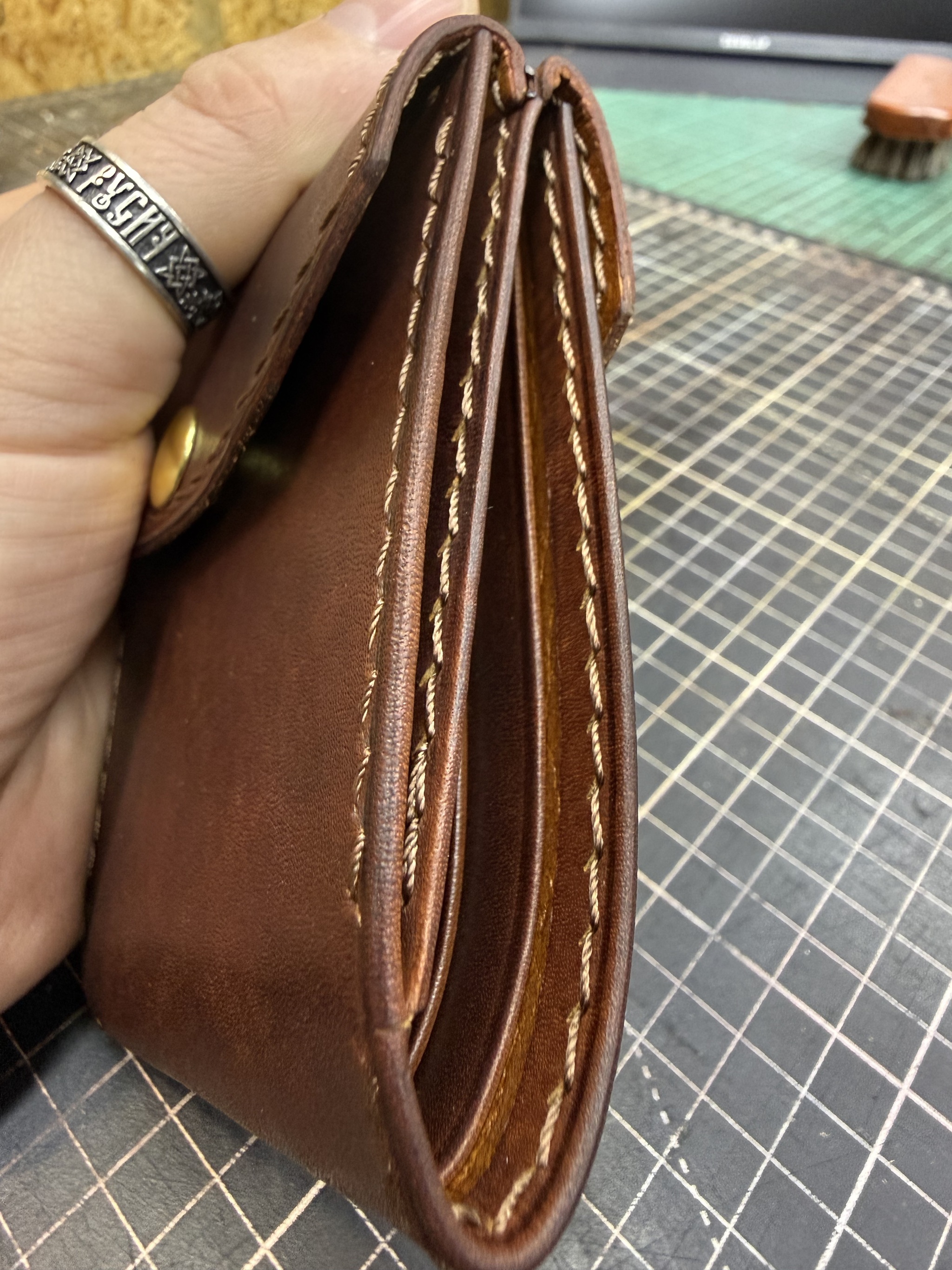 Резюме. Технически это одно из самых сложных моих изделий, при всей кажущейся простоте. Я взял некрашеную кожу в толщине около 1.4 мм (остаток рулона видно на фото/видео), снял толщину вручную вдвое. Покрасил, финишировал и собрал с загибом на урезах. Есть огрехи, есть к чему стремиться, но я доволен.