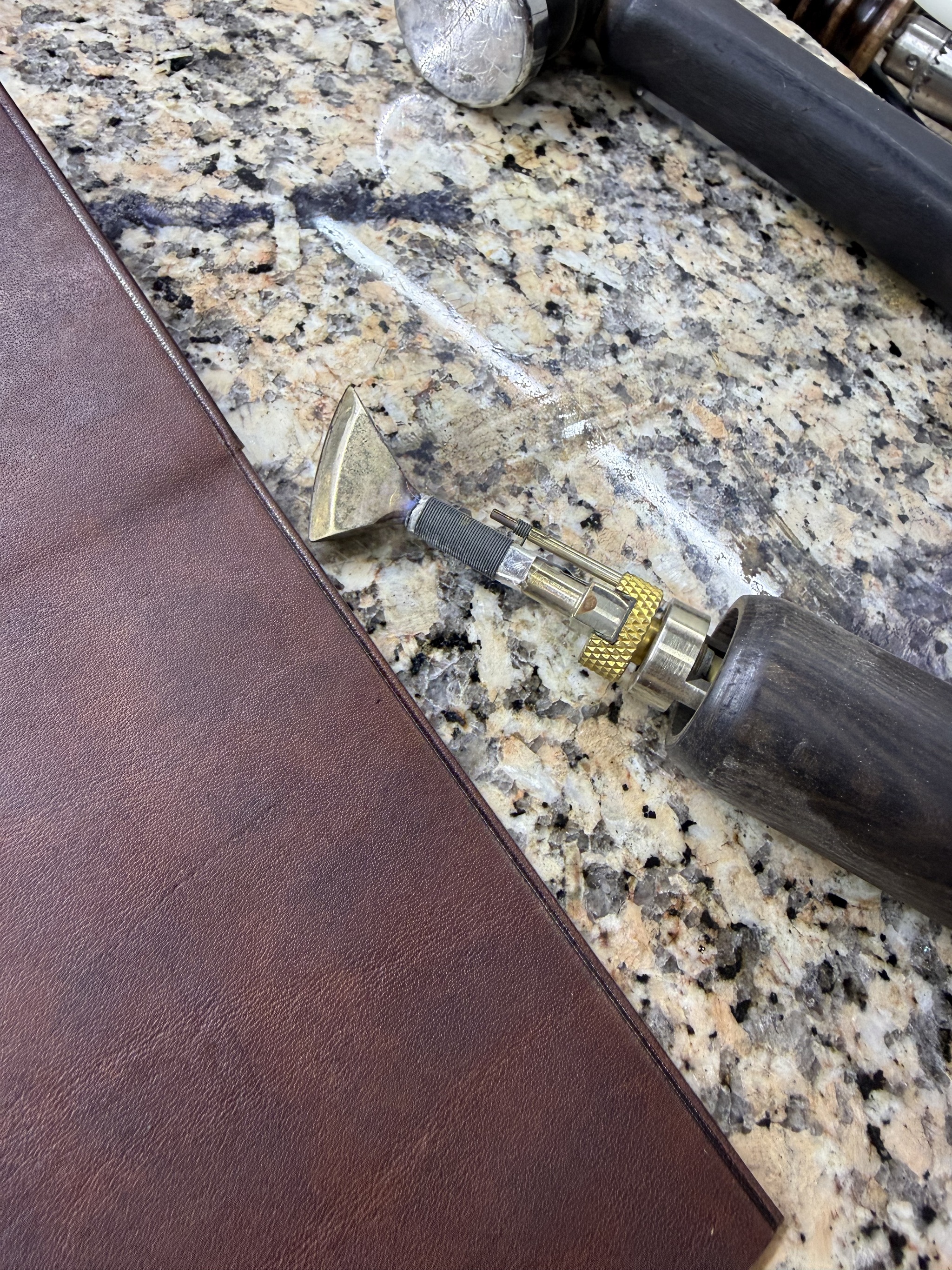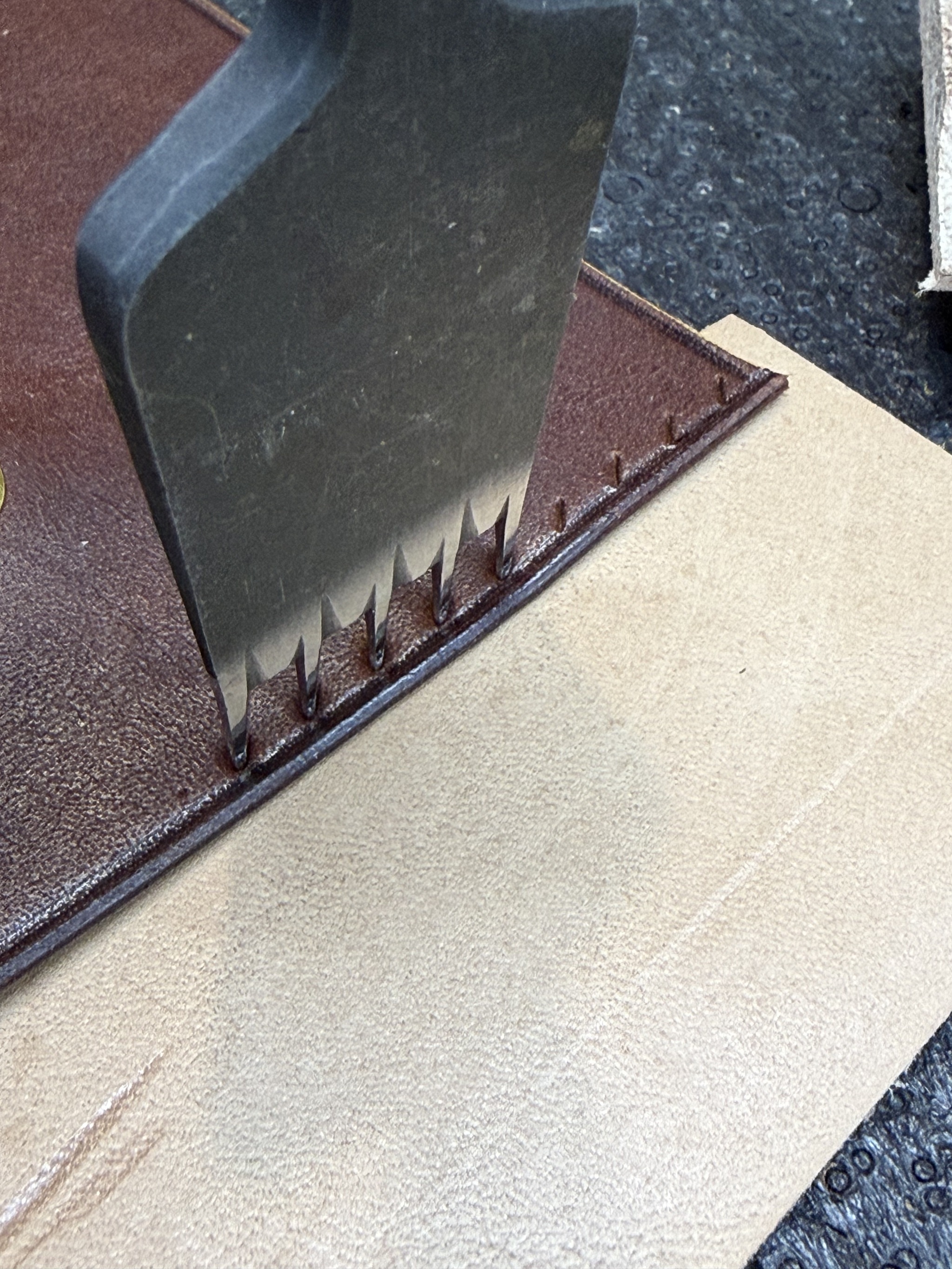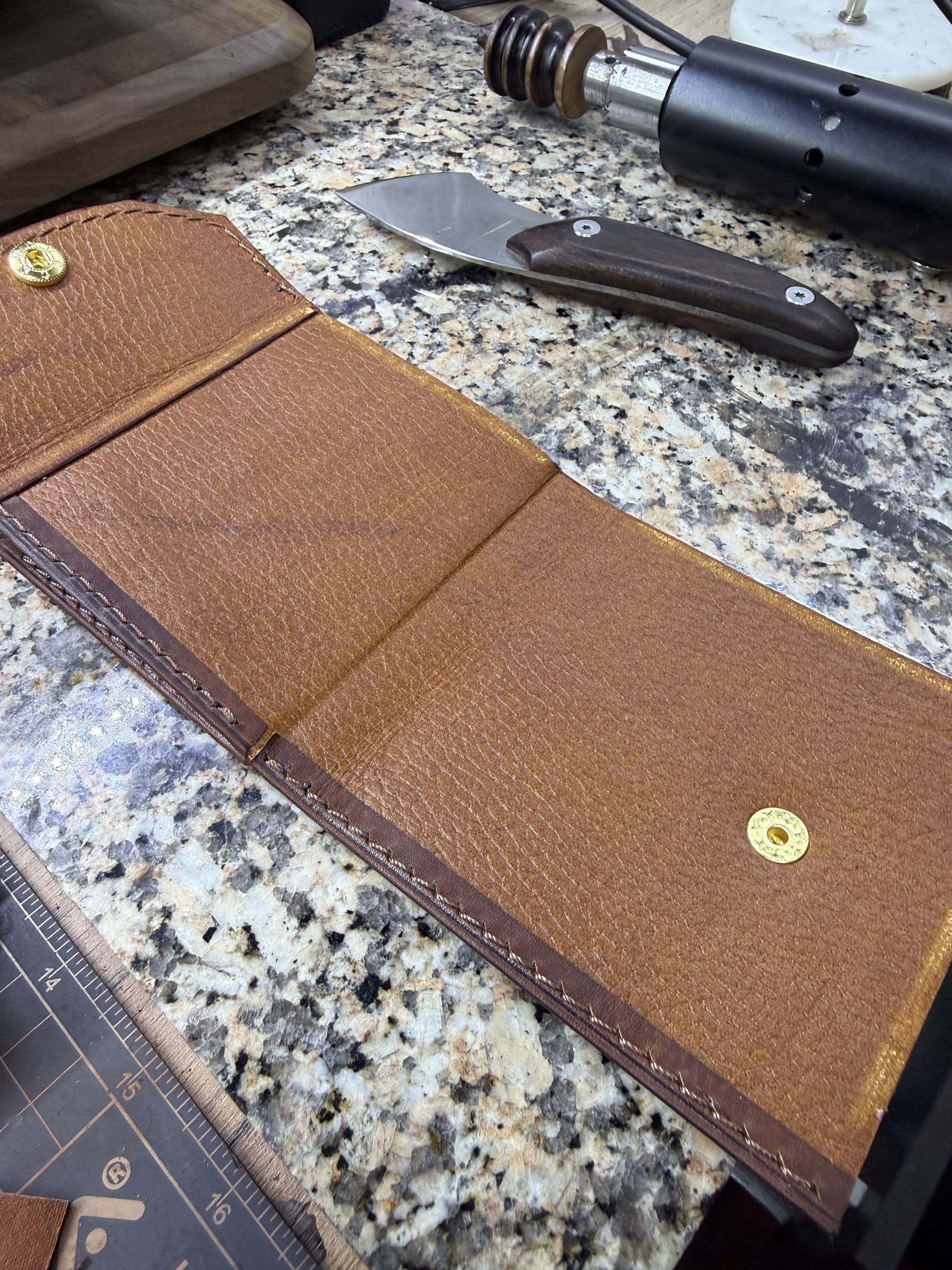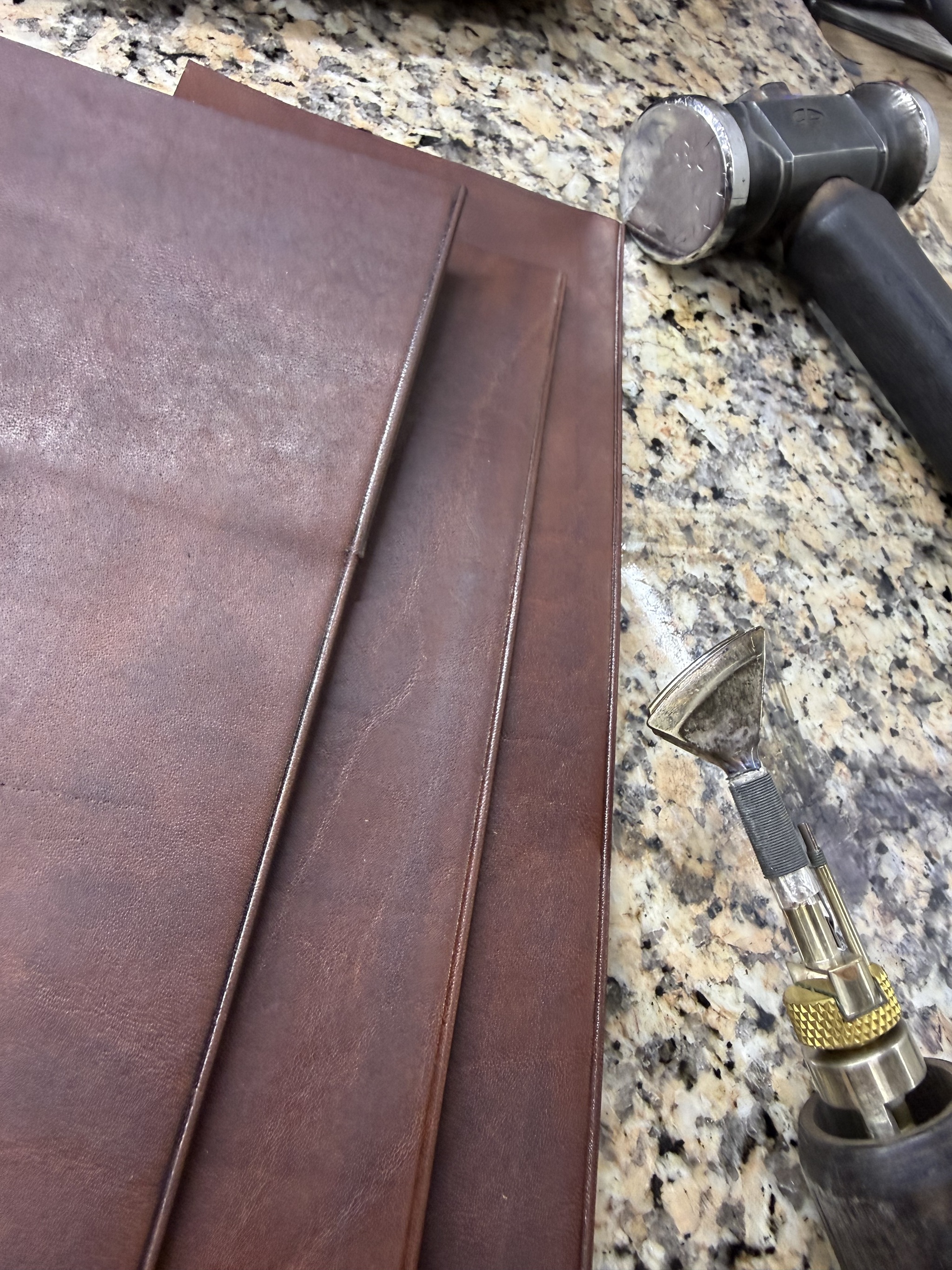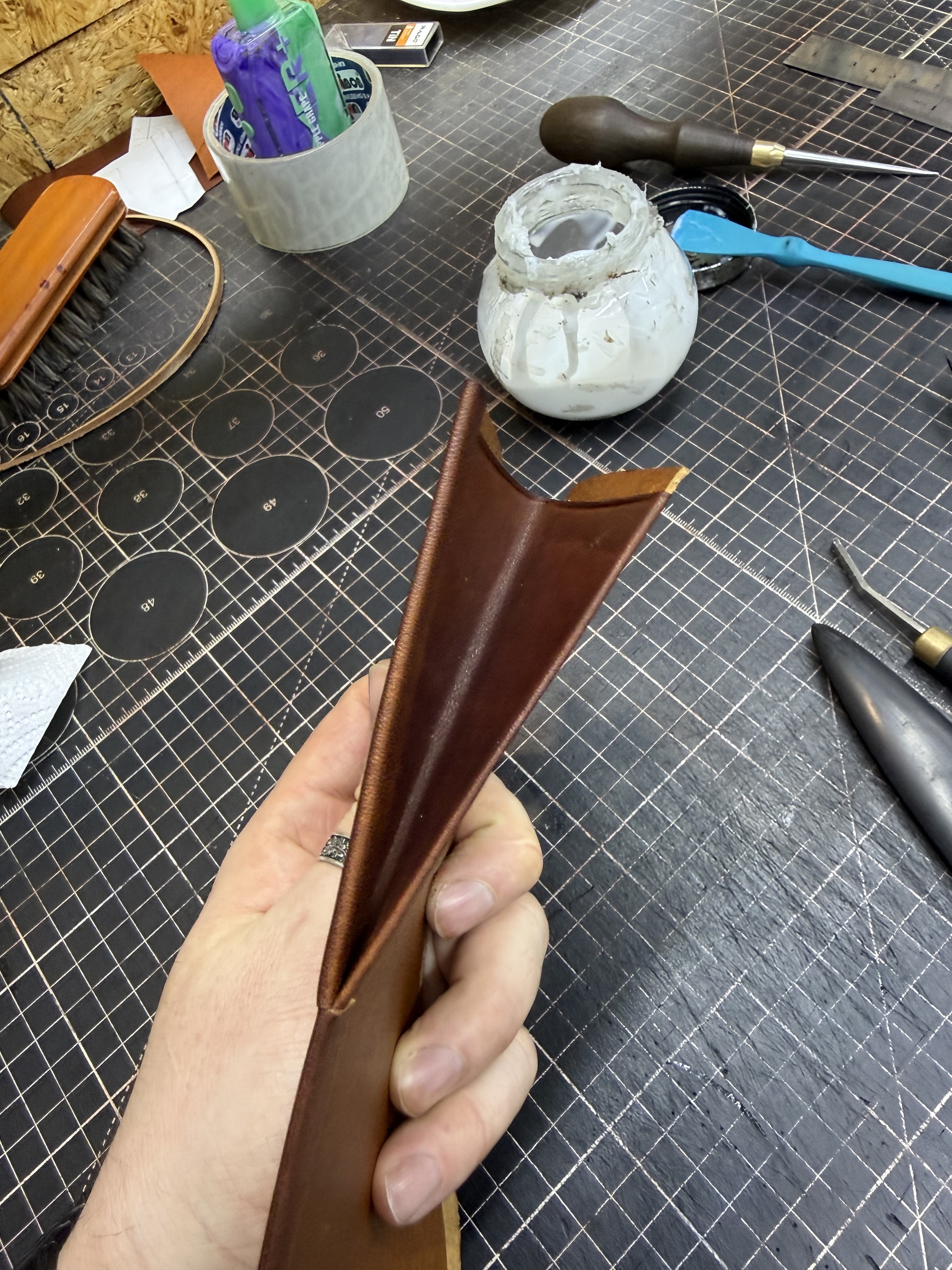 Резюме. Технически это одно из самых сложных моих изделий, при всей кажущейся простоте. Я взял некрашеную кожу в толщине около 1.4 мм (остаток рулона видно на фото/видео), снял толщину вручную вдвое. Покрасил, финишировал и собрал с загибом на урезах. Есть огрехи, есть к чему стремиться, но я доволен.