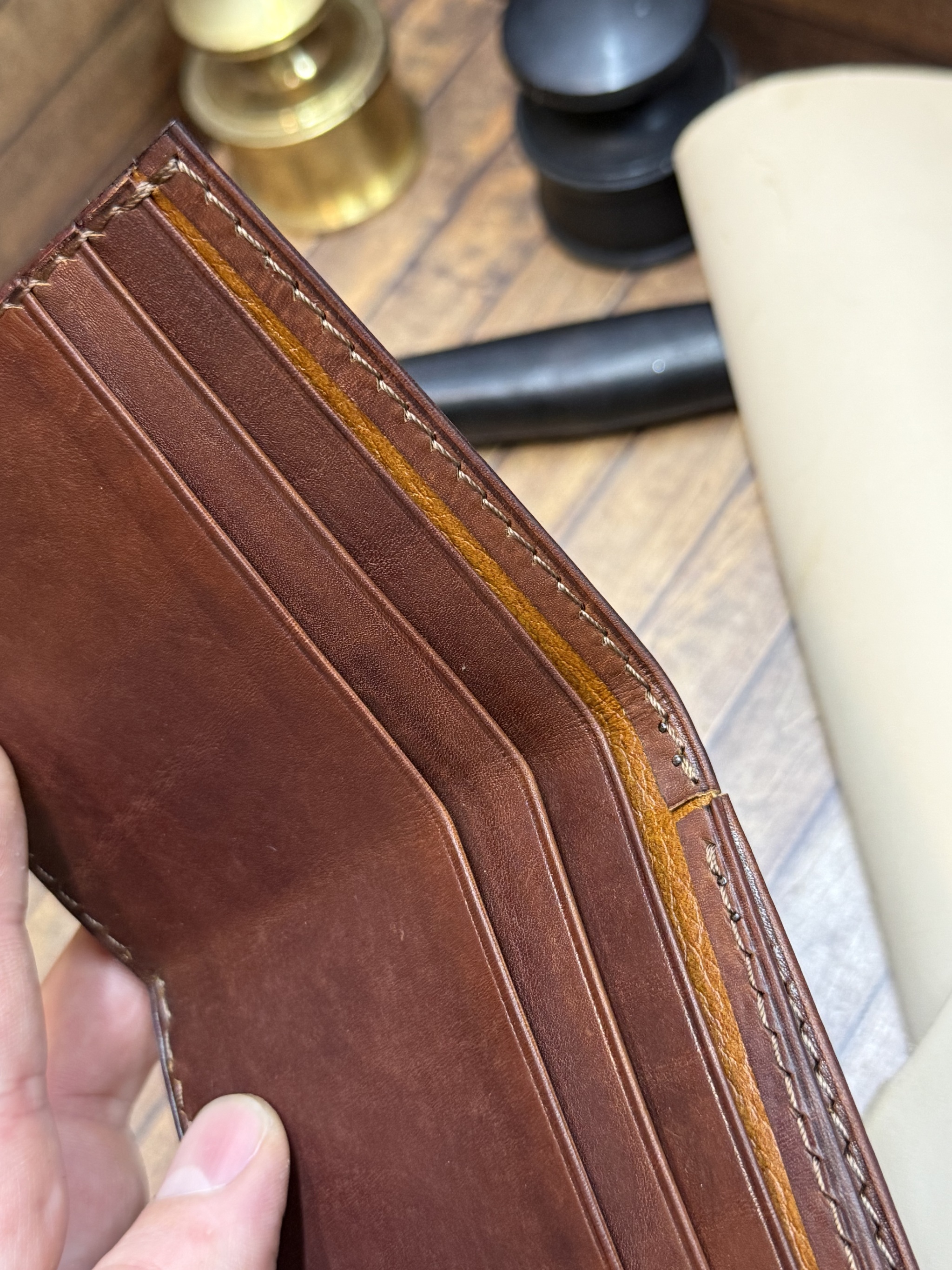 При всей кажущейся простоте, здесь сразу несколько технически сложных задач. Первое: урезы необходимо сделать в загиб. Второе - встроенный с торца карман для мелочи под клапаном. Третье - внутренние отсеки для налички/карт, их три штуки и для нормального расположения денег, нормального закрывания кошелька каждый из отсеков должен быть немного короче предыдущего. При этом общая разница не должна быть слишком большой. А и да, кожу необходимо сшерфовать примерно до 0.7 - 1 мм. на деталь, чтобы кошелек не был толстым бутербродом.