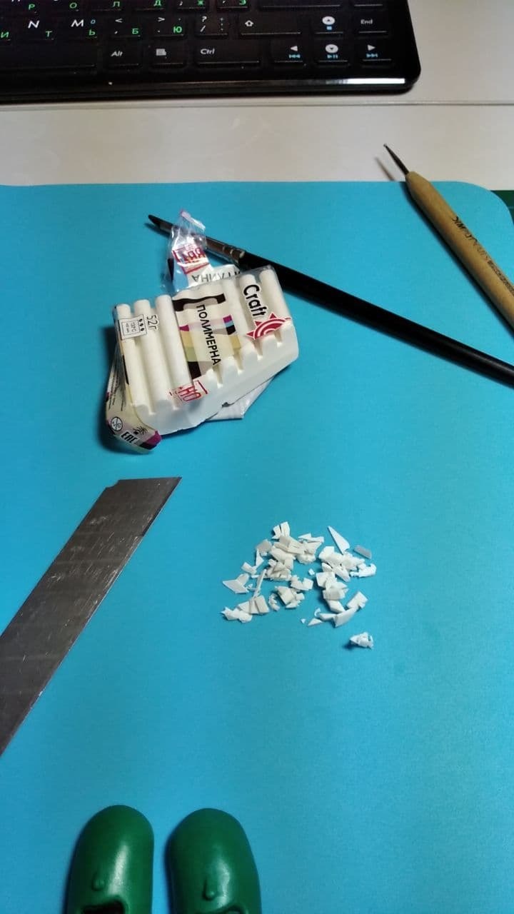 Так же с белой полимерки раскатываем небольшой кусок, отрезаем ровную полоску, нарезаем ножом будущие зубы