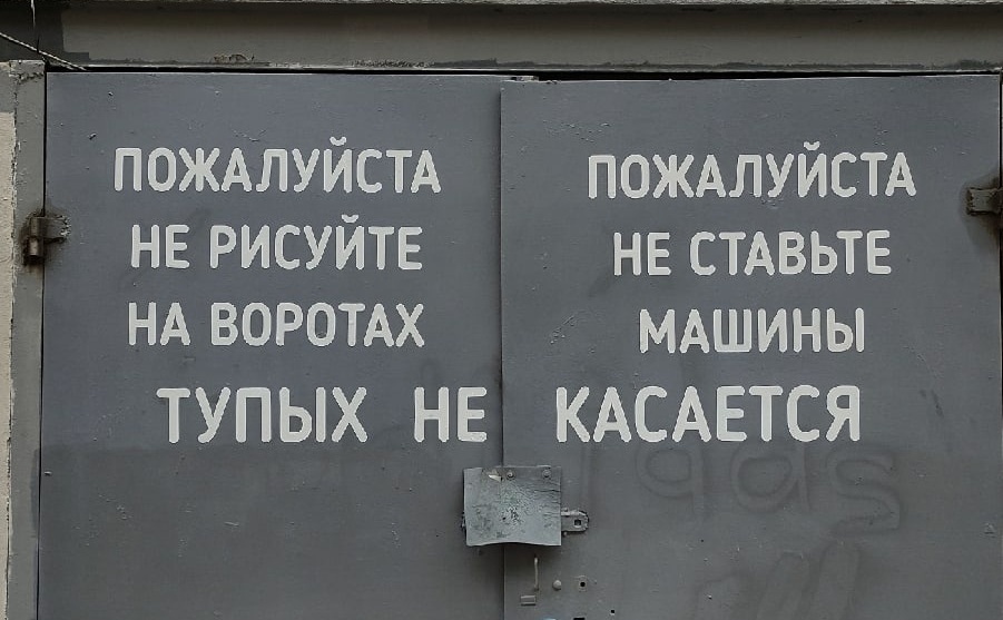115 glebklinov ВПитере Простые правила Петроградки 3 года назад 1. Быть вежливым, пожалуйста.2. Не рисовать на воротах тупых.3. Не касаться машины. Дополнительные правила:4. Не рисовать тупых на воротах.5. Не рисовать на тупых воротах.6. Не ставить машины на тупых.7. Вообще никогда не ставить на тупых. [моё] Санкт-Петербург Надпись Объявление Нельзя Надпись на стене Ворота 1 1 Ещё 0