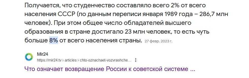 Уравниловка зарплат приводит к отсутствию надобности в дальнейшем обучении у большей части населения. И все наши проблемы сегодня, что у нас людей с ВО закритически мало. Было ли в СССР "самое лучшее образование" или нет, но процент людей с ВО в СССР в лучшие годы составлял 7-9%... Для сравнения, в США процент людей с ВО был 31%.