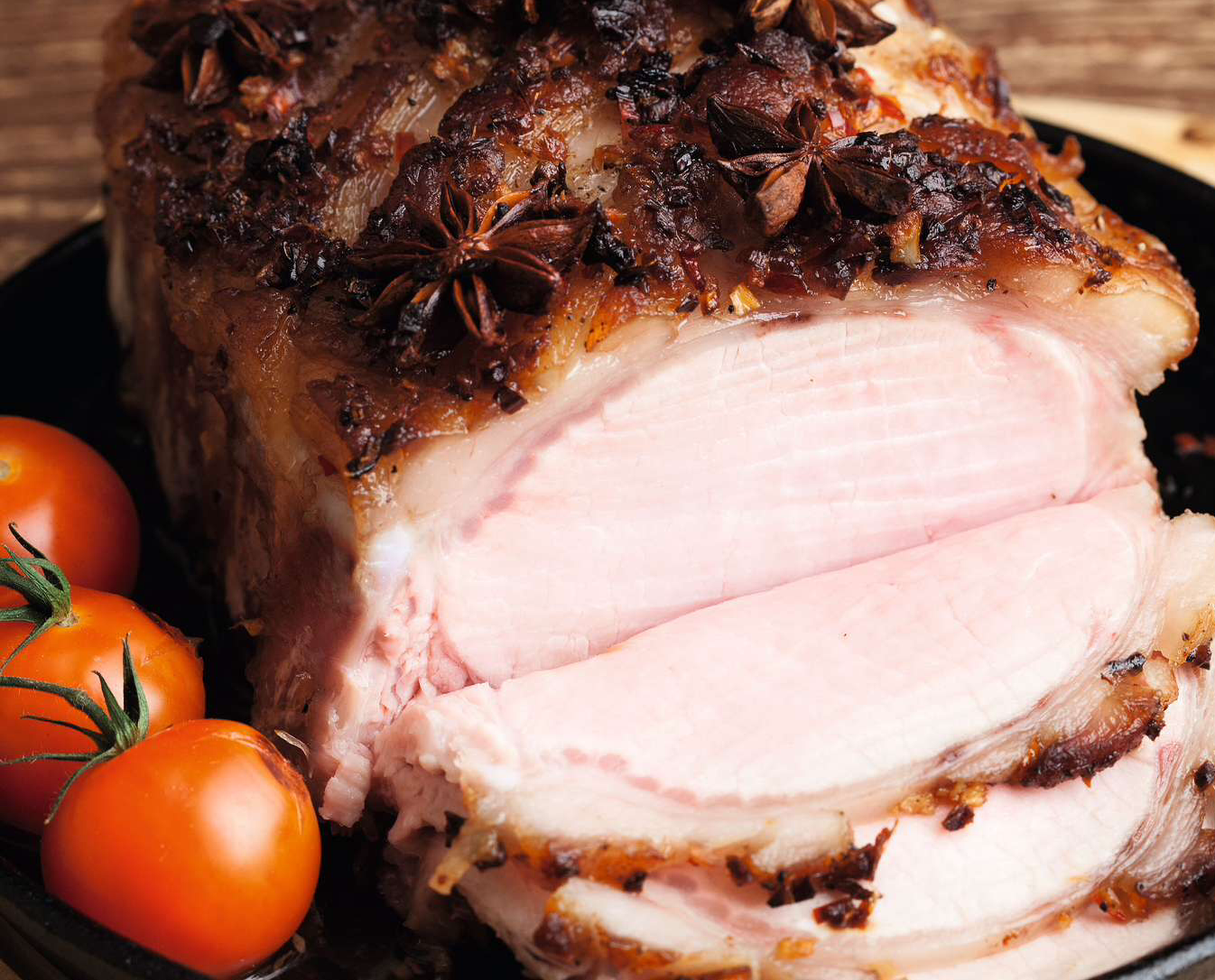 Нашпиговать свинину бутонами гвоздики. Сверху выложить звездочки аниса. Залить корейку оставшимся медовым соусом и оставить на 4 часа мариноваться.