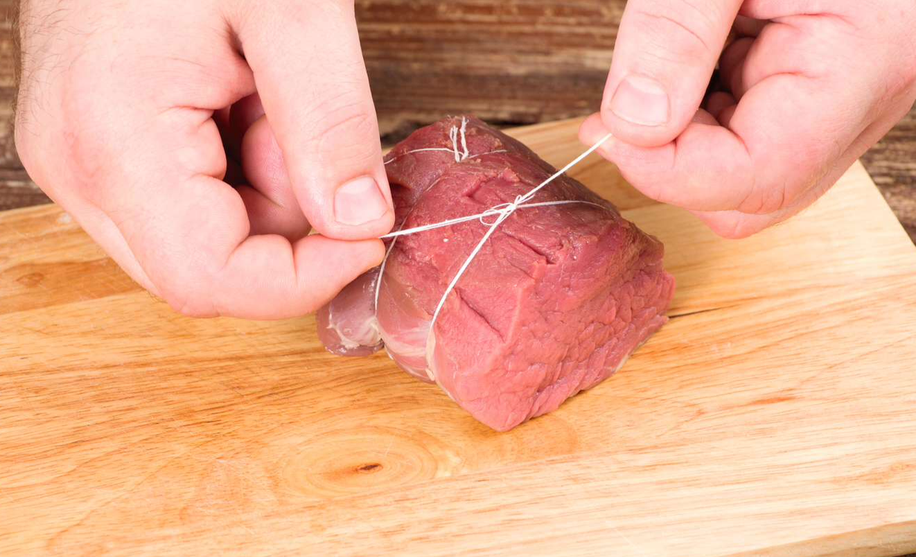Говяжью вырезку вымыть, обсушить, очистить от пленок. Нарезать на порционные куски толщиной примерно 5 см. Обвязать говядину ниткой с двух сторон вокруг волокон да того, чтобы мясо сохранило изначальную форму.