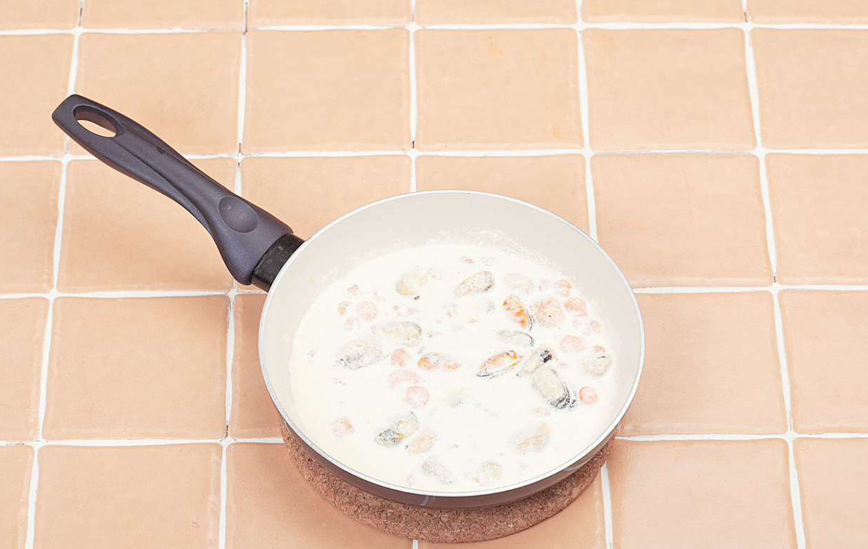 Припустить креветки и мидии в сливках в течении 1-2 мин., чтобы морепродукты раскрыли свой сладкий вкус, но не стали "резиновыми". При необходимости загустить мукой.