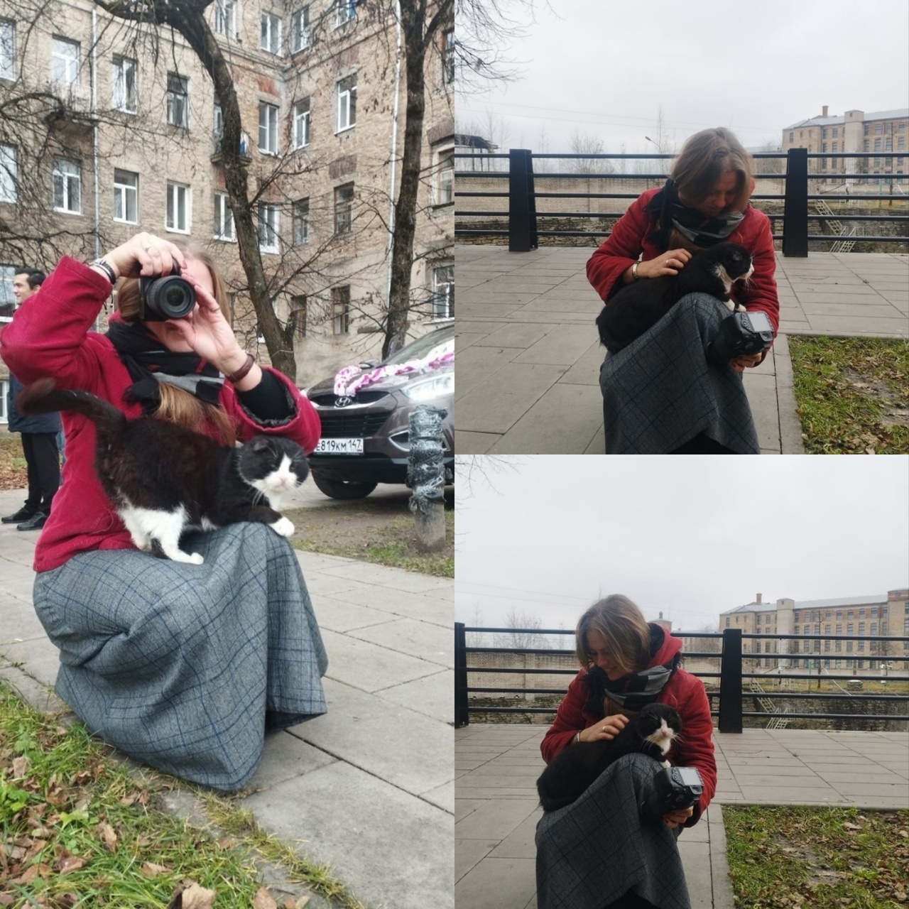 Приезжаем на шлюзы, я сажусь на корточки. Из ниоткуда возникает котик, залезает на коленки и начинает всяко клубочится. Хорошая вещь- коленки. И теплая подставка под лапки, и лежанка...