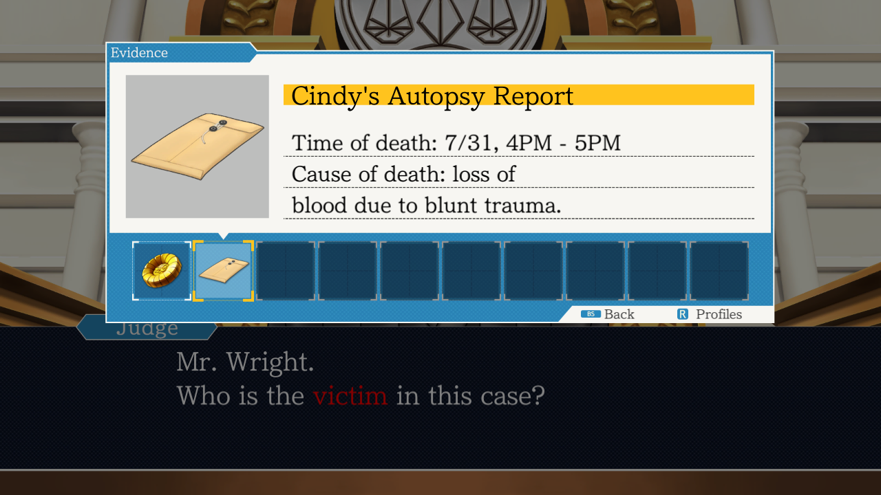 Здесь может быть как отчёт патологоанатома, так и различные доказательства или улики, что можно показывать в зале суда, или предъявлять, ощущая что свидетель лжёт. Что же это всё понятно, но не спешите.