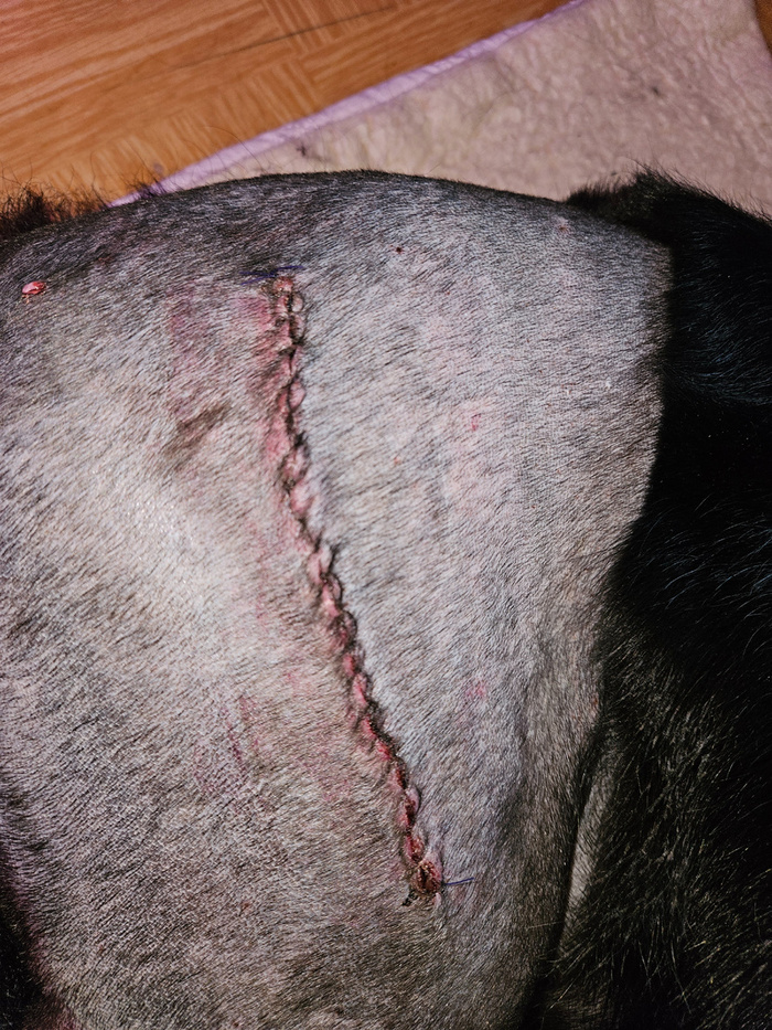 К вечеру настал момент первой прогулки. Это было кошмарно. В первую очередь потому, что мы сами не знали как подступиться к собаке и что с ней делать. Вообще самым ужасным временем были первые сутки. Они тяжелее всего. Пока не знаешь что и как с собакой делать, как ходить, как носить, где держать. Но адаптация проходит быстро и к концу первой недели уже уровень комфорта близок к привычному. А на первую прогулку мы шли с шарфом под пузом, придерживая заднюю часть немного на весу, чтобы вес тела не полностью приходился на задние лапы. Собаке это, понятно, было не торт. Она оглядывалась, еле переставляла лапы. На улице быстро сделала все дела и мы понесли эту кракозябру домой. Дома обработали шов, выдали положенные таблетки и все втроем рухнули спать. У собаки явно был отходняк, так что ее срубило моментально.