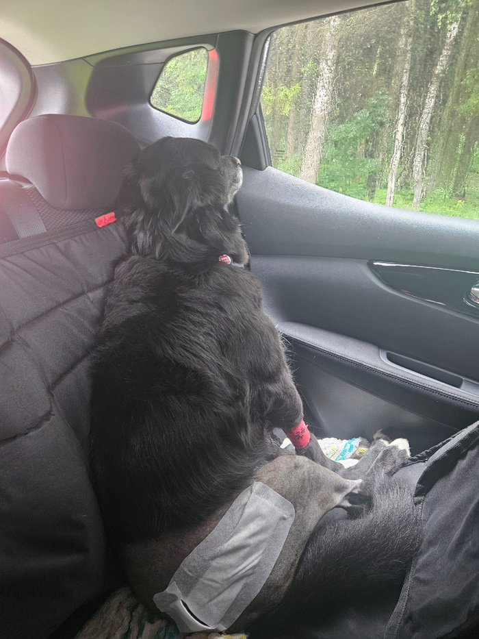 Басю нам вывели двое врачей. Один вел за поводок ,второй поддерживал на специальной переноске задние лапы. Встреча была душераздирающей, конечно. Бедная пёса кричала в голос и пыталась залезть на руки или впитаться в нас полностью. Но сразу хочу отметить, что это - индивидуальная реакция нашей конкретной собаки. Она с самого щенячества была крайне недоверчива к людям и за все 9,5 лет жизни никогда не оставалась с посторонними. В отпуск и любые поездки она всегда ездила с нами. Потому эти три дня без нас дались ей очень тяжело. И не ела она именно потому. Подозреваю, что другая более эмоционально устойчивая собака будет чувствовать себя более спокойно, т.к. объективно отношение в клинике к пациентам максимально трепетное и нежное. С помощью сотрудников мы загрузили наше сокровище в машину и поплелись домой, т.к. было страшно ее растрясти.