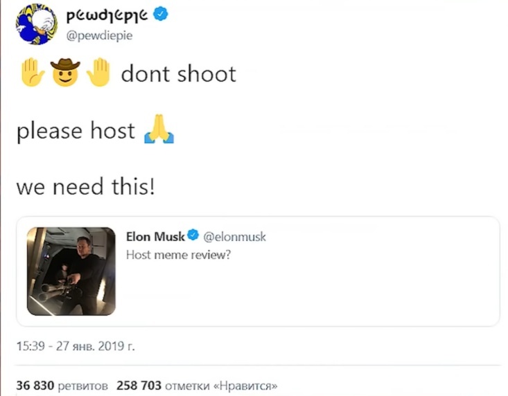 Ещё больше разжигает огонь в этом противостояние недавний пост Илона Маска в твитере, где он предложил сняться в популярной рубрике Феликса "Мем обзор" или любой другой. К посту Маск приложил эпичное фото где он держит огнемёт (дабы не оставлять фотошоперов без работы). Феликс ответил своим твитом на предложение Маска с подписью: "Пожалуйтса не стреляй. Это какрас-таки,то что надо". Это явно бы создало хайп вокруг канала PewDiePie, а также надежду на победу в схватке.