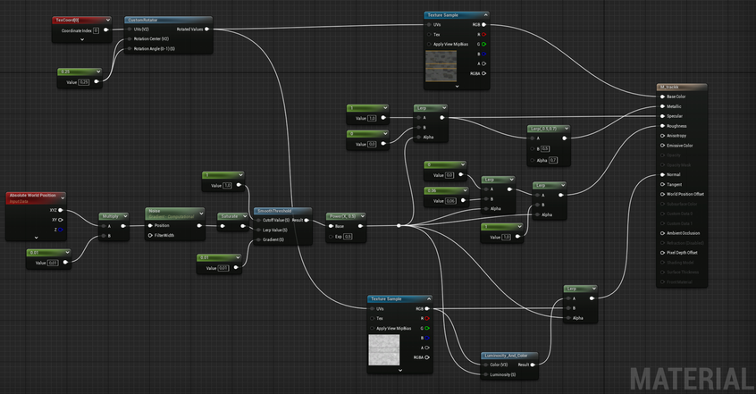 Во вход A новой ноды Lerp подключите выход ноды Luminosity_And_Color. Выход последней подключите на выход Normal материала M_Track.