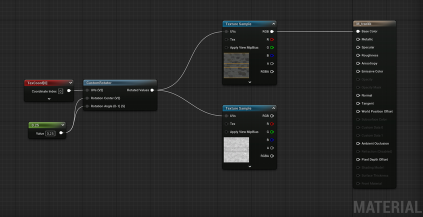 Выход ноды CustomRotator подключите во вход UVs к обеим нашим текстурам. Текстуру Road003_8K_Color подключите к Base Color материала M_Track.