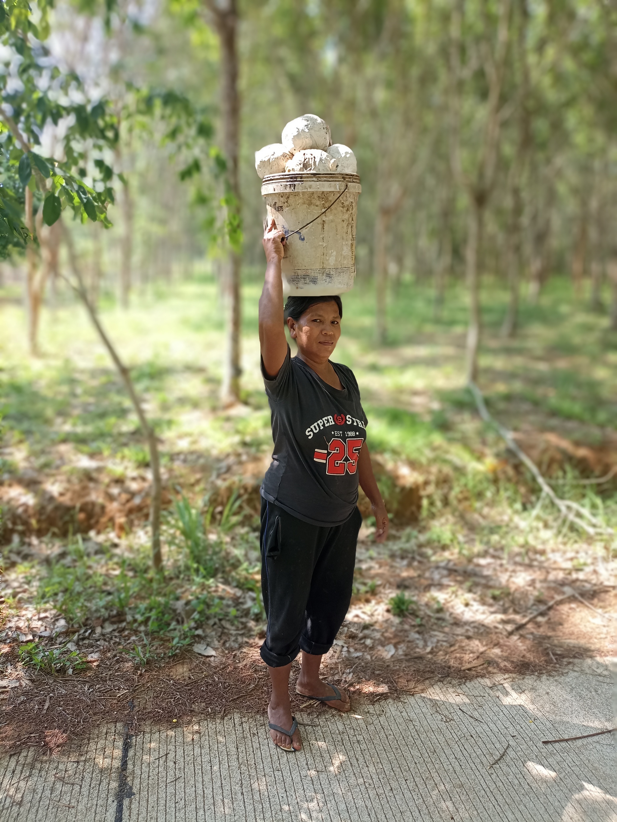 В течение дня чашка наполняется, а сок в ней затвердевает, превращаясь в некое подобие резиновой полусферы. Тот же мужичок извлекает эту полусферу, но не убирает её, а переворачивает, высвобождая пространство в чашке и делает новый надрез на дереве. Ещё через день в чашке лежит уже вот такой мячик.