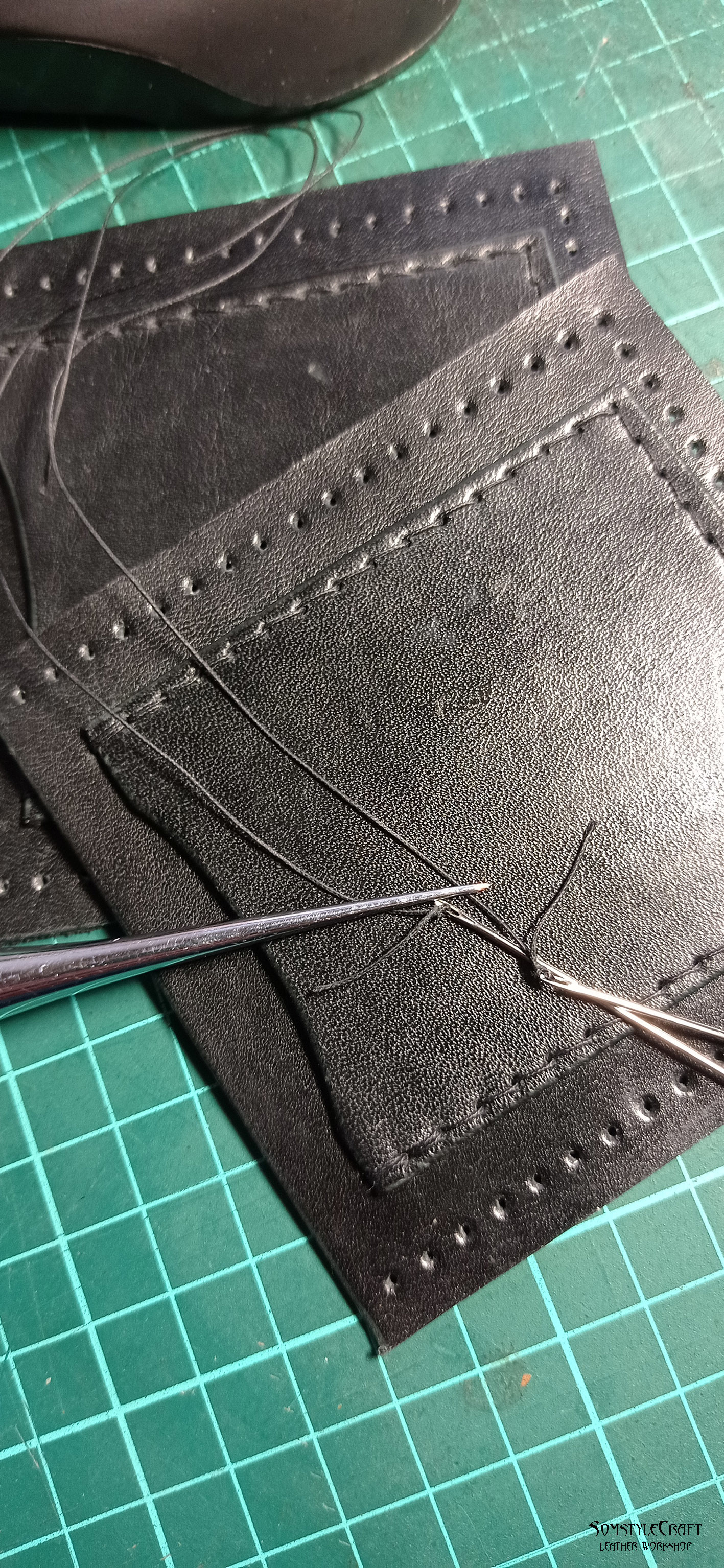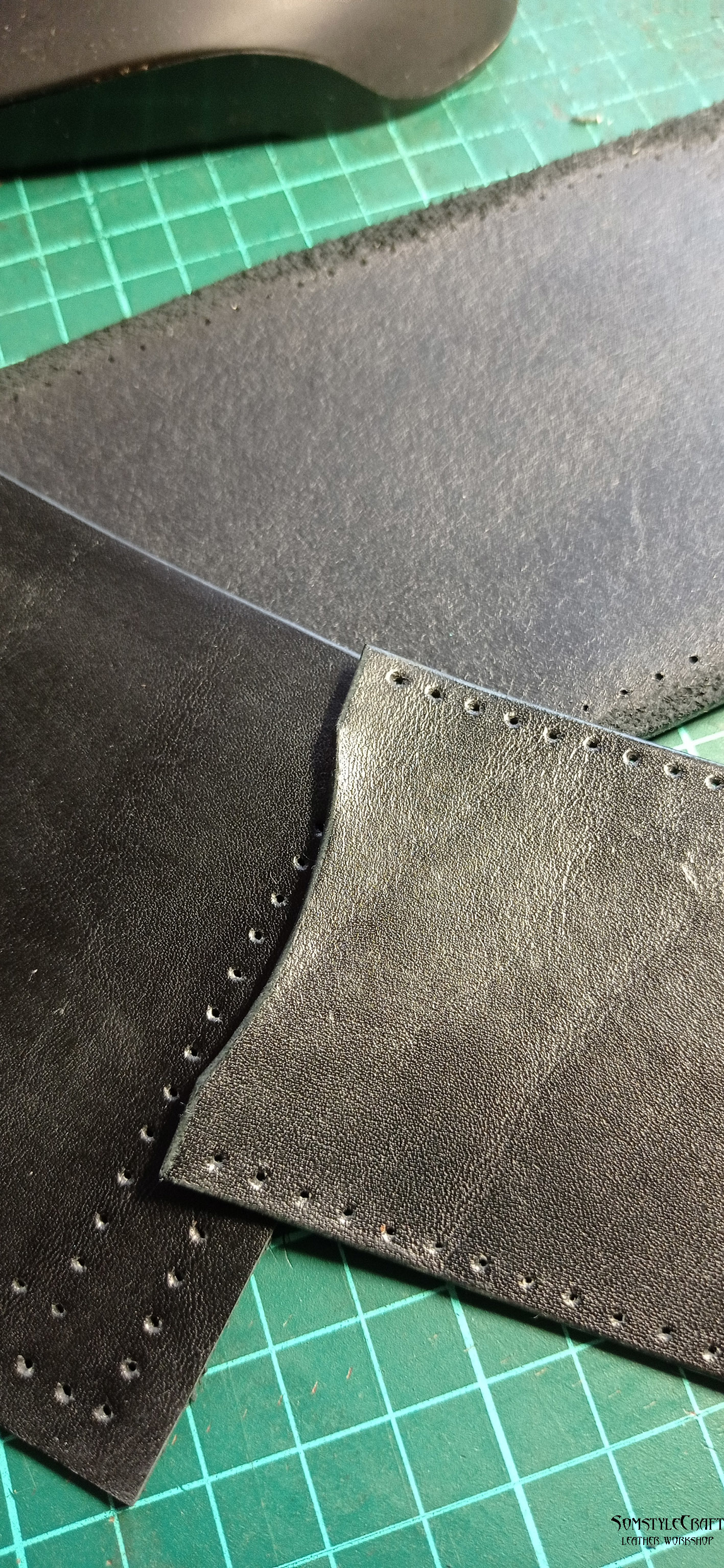 Процесс наклеивания выкройки и пробивания отверстий под шов не снимал, там ничего нового. Пробойники PGF с шагом 5 мм.