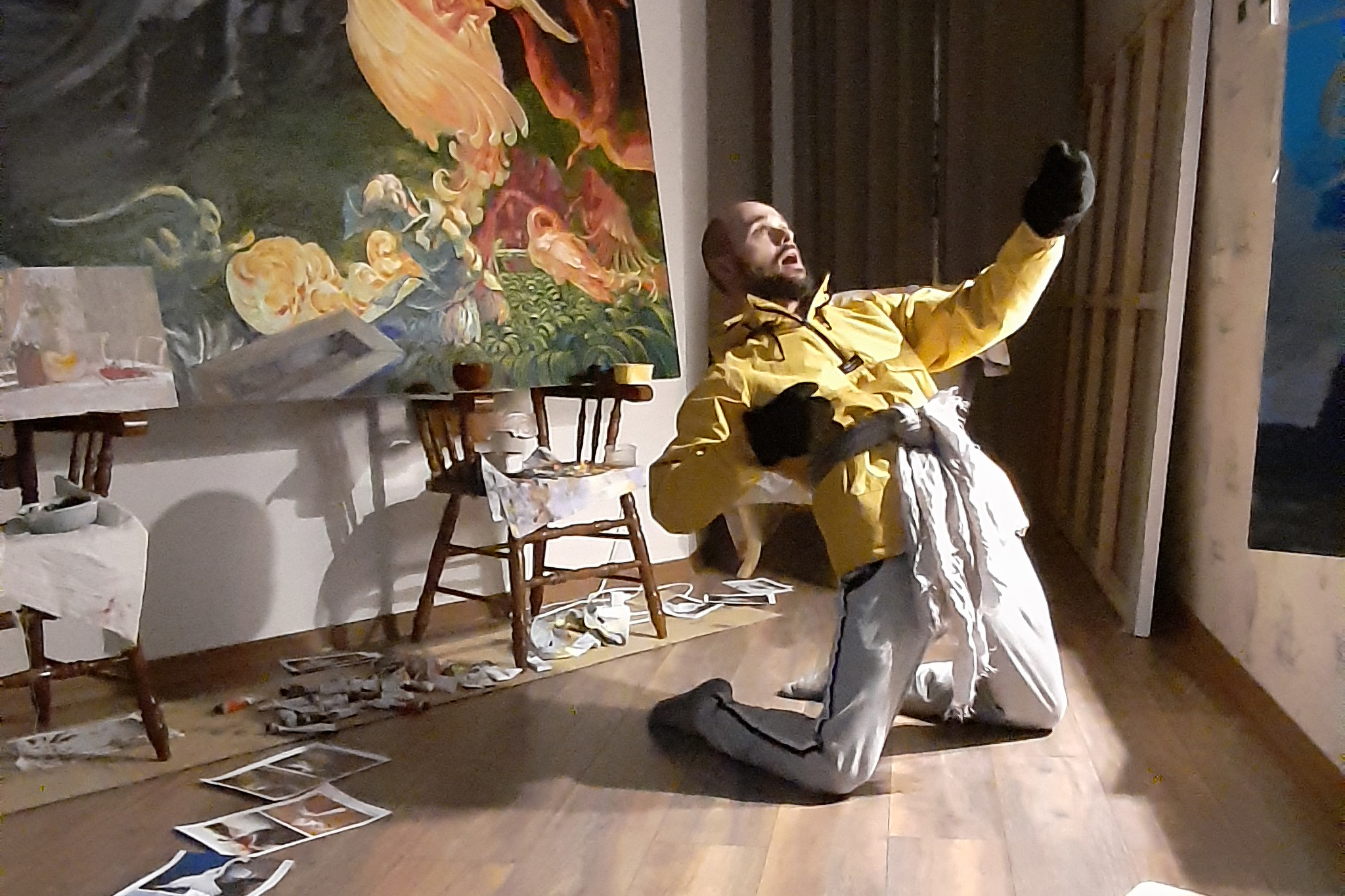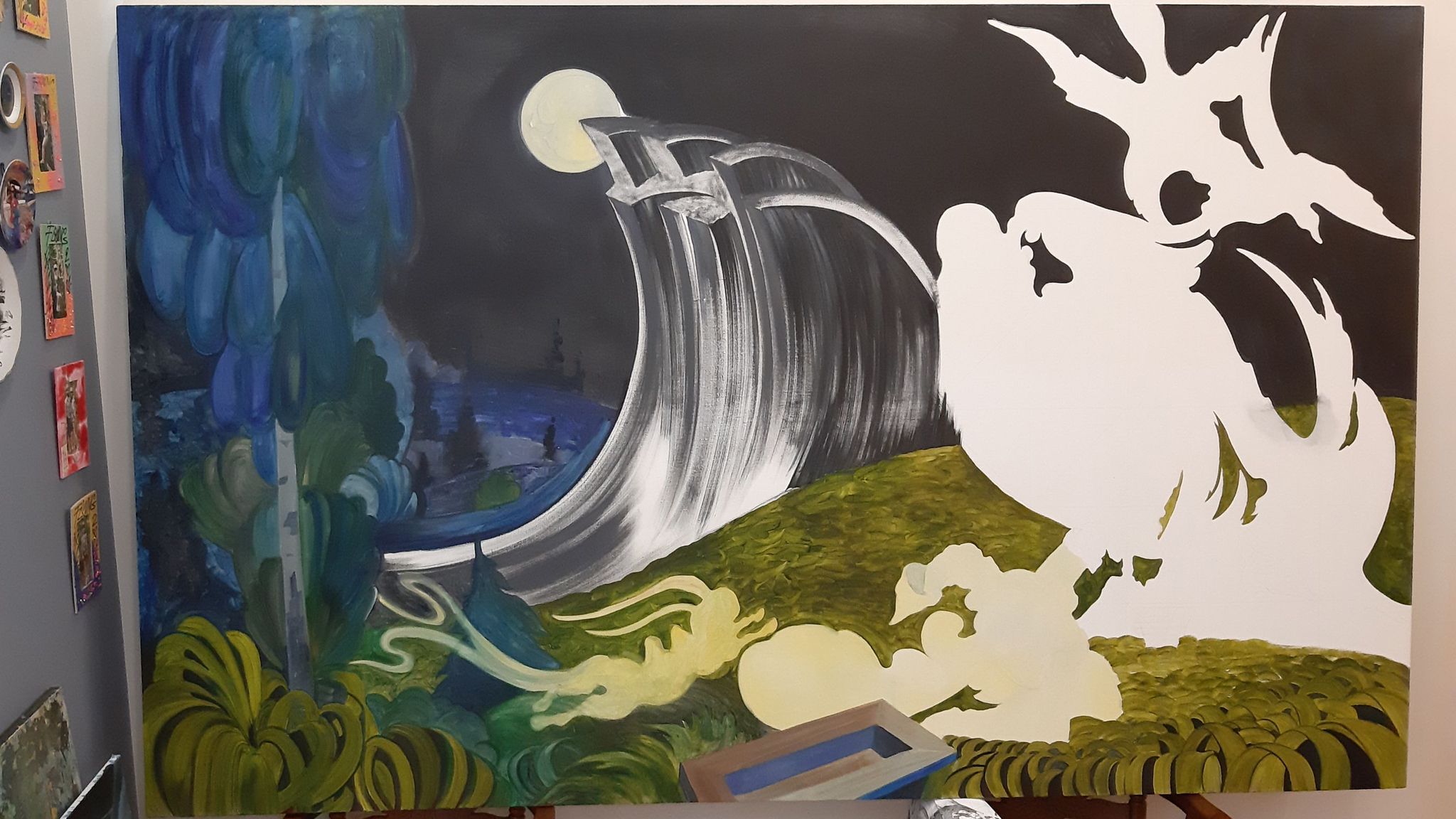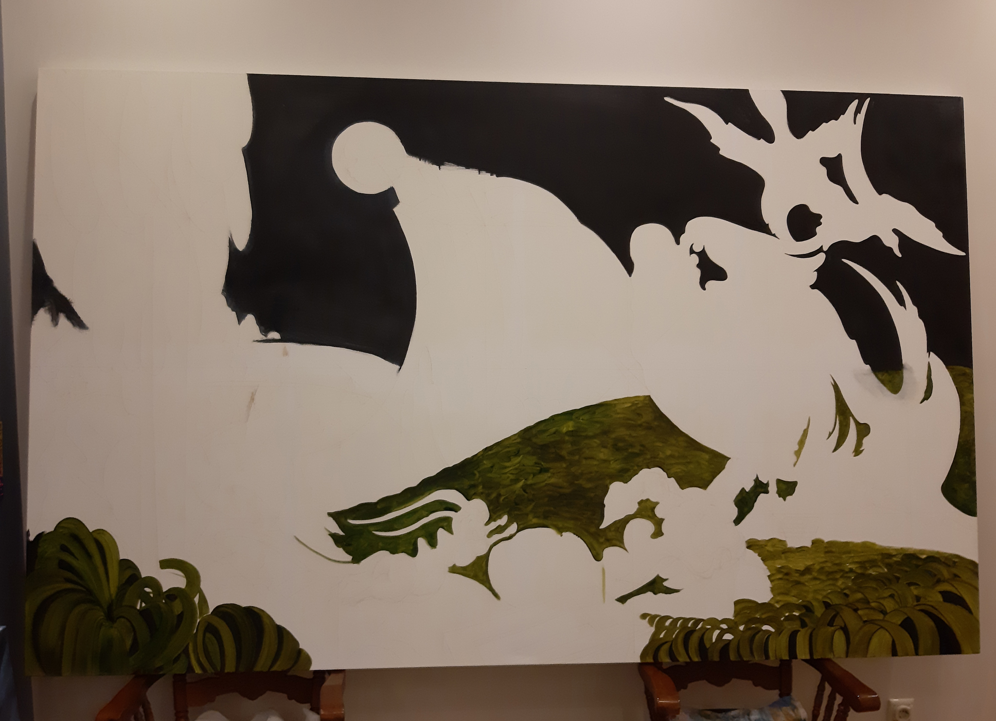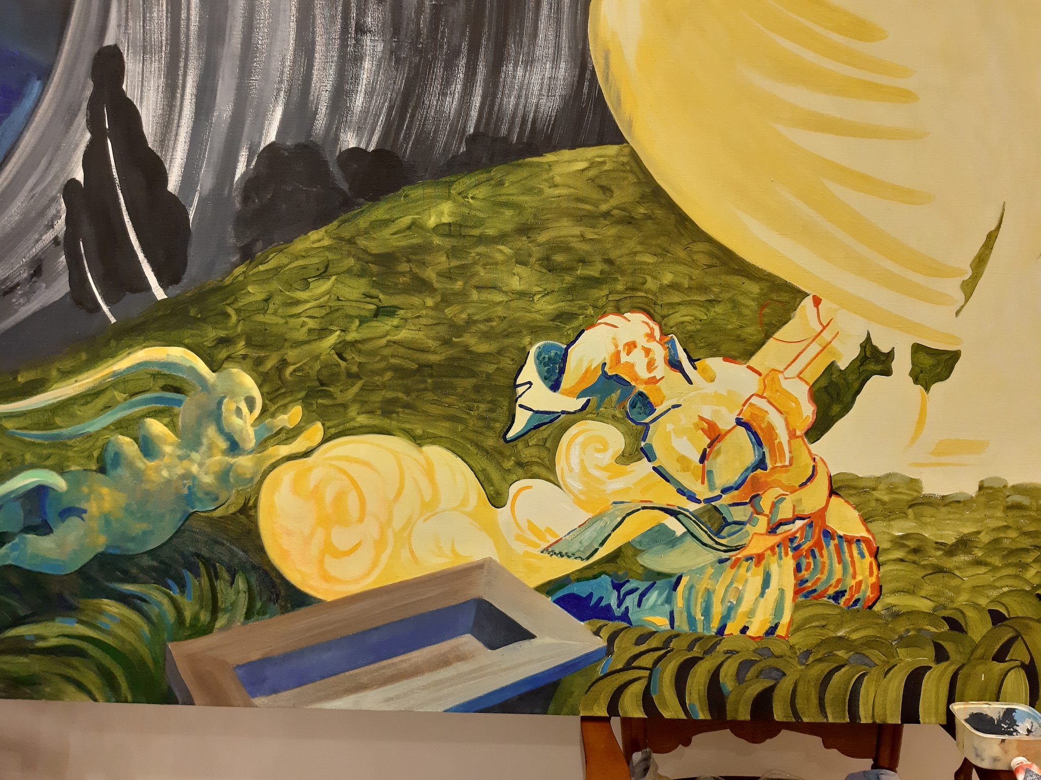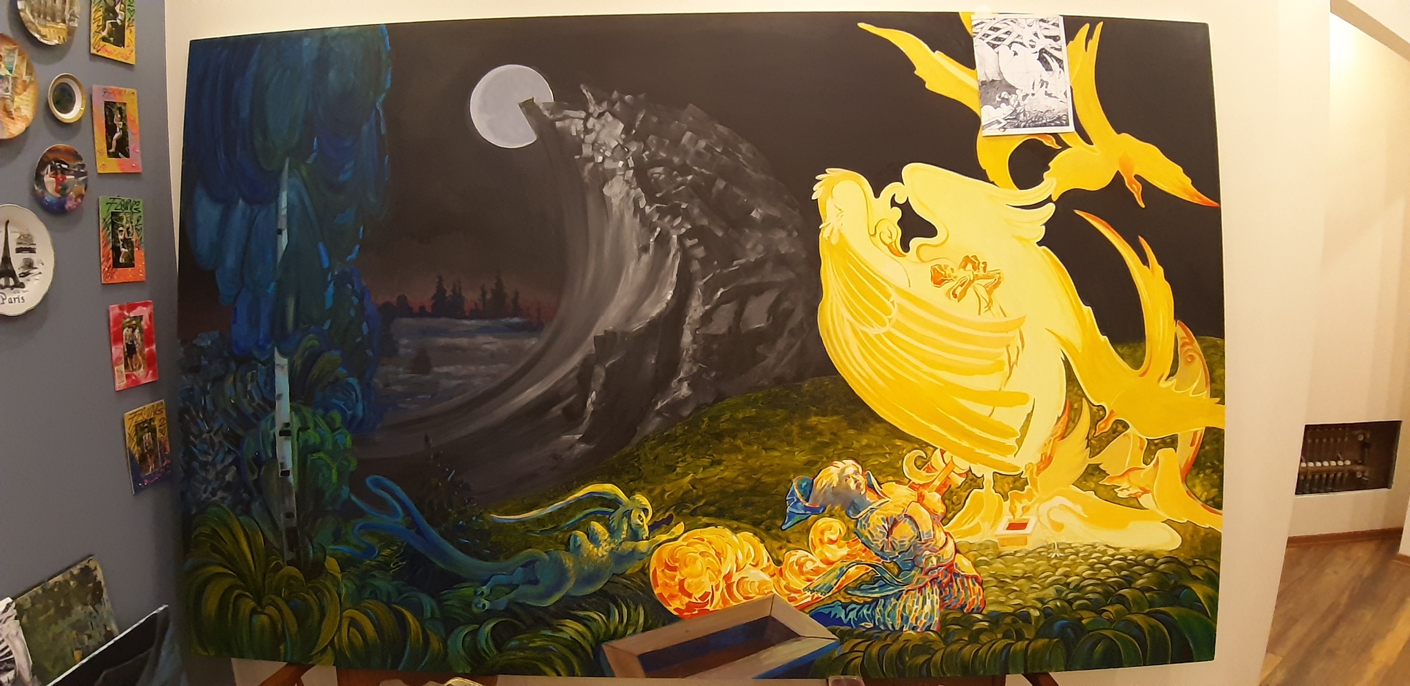 Работа на большом формате начинается с эскиза, который затем переносится на холст.