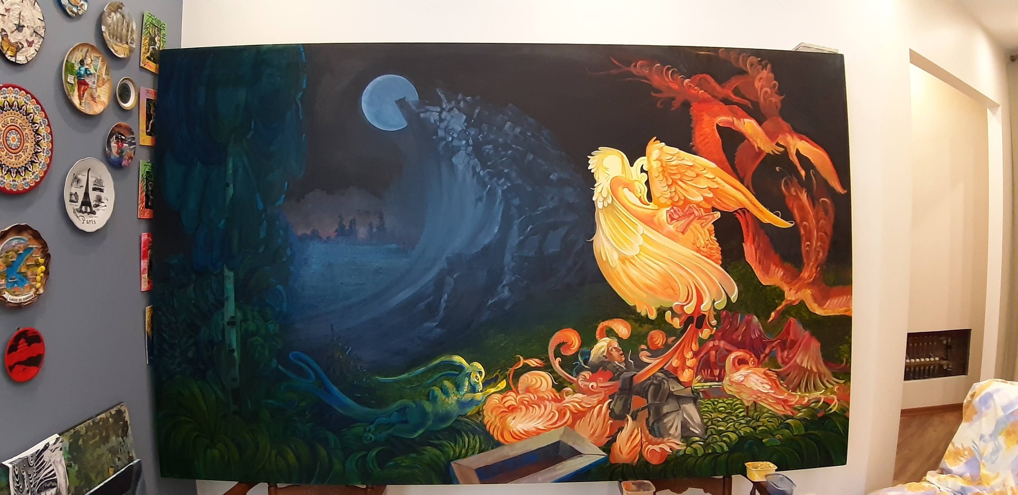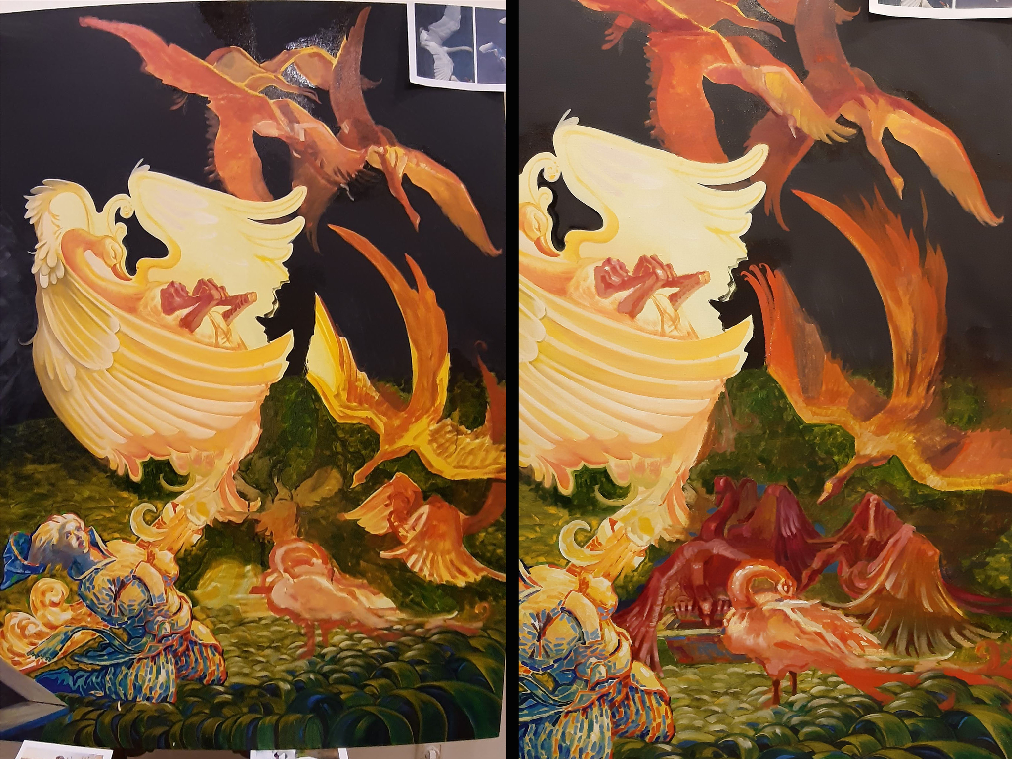 В процессе художественной работы приходится несколько раз перерисовывать персонажей, менять композицию, добавлять или убирать различные элементы в связи с тем, что большой формат диктует новые условия для восприятия, а следовательно изменения в самой работе.