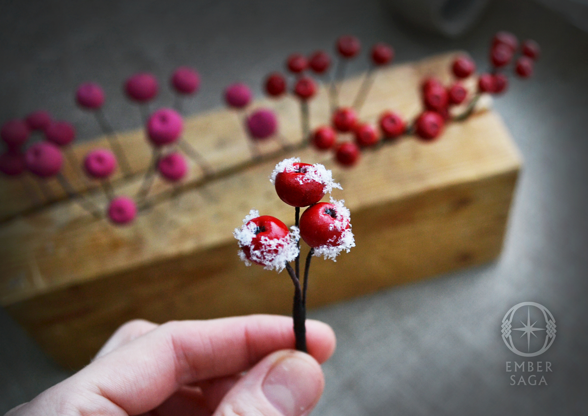 Минуя возню, подготовительные, не особо художественные этапы, оставила самое приглядное. Нарезаем проволоку, обматываем гофрой, красим. Лепим ягодки (в данном случае из зефирного пластилина), натыкиваем на проволоку, оставляем сушиться. (Я в ходе работы из некоторых ягодок золотые яблочки сделала:)) Красим краской, затем лаком, собираем в веточки, затем добавляем снежка ❄ Украшаем ягодками жизнь ☺💫