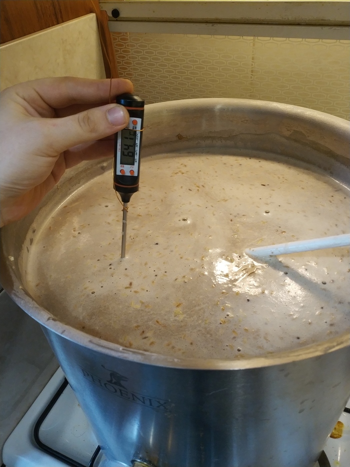Следущий этап-нам нужно поднять температуру до 63-64 градусов. Выдержать ее 30 минут (я пока так делаю первый раз, обычно делал паузу 67-68 градусов на час и все). Это "пауза на алкоголь".