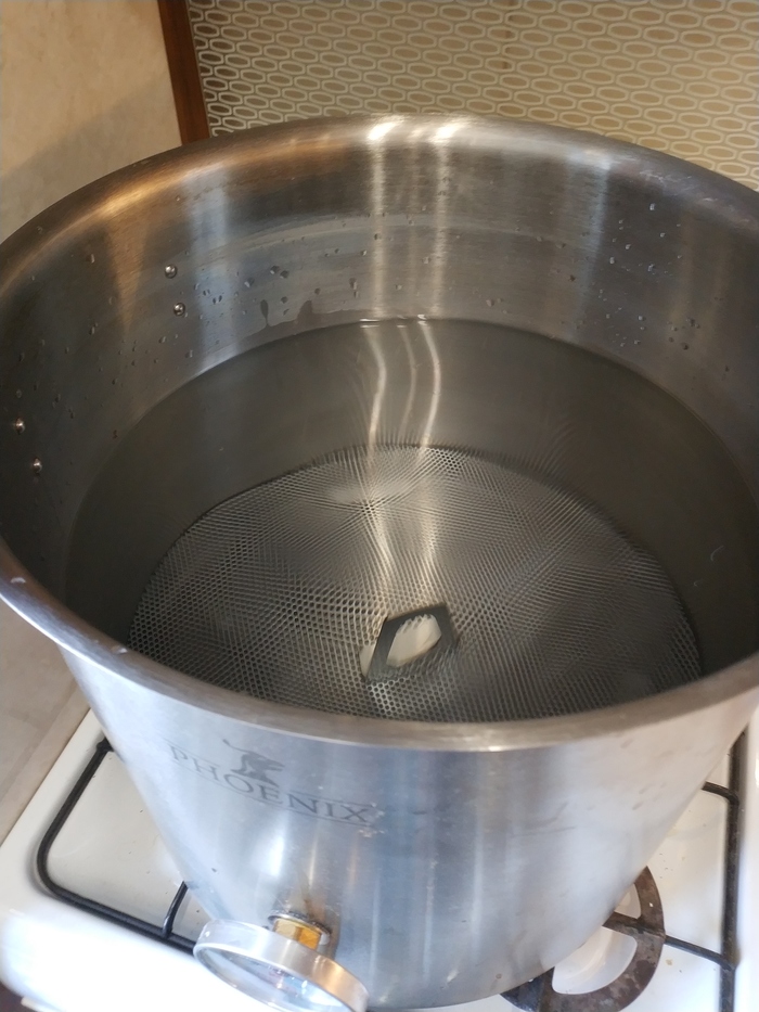 За 25 минут до конца кипячения погружаю в сусло чиллер, чтобы он прокипятился.