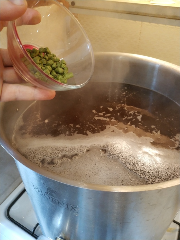 За 10 минут до конца кипячения кидаю хмель на аромат