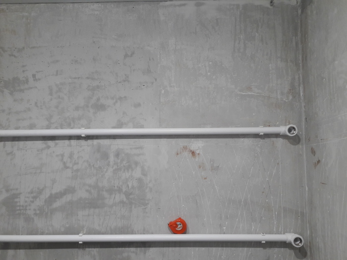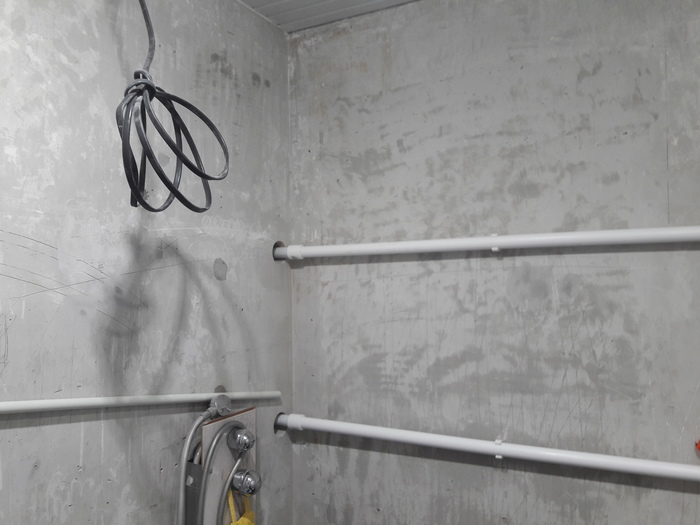 На момент начала ремонта к ванной комнате уже были подведены пять вводов водопровода (раковина Х+Г, душевая кабина Х+Г, стиральная машина Х), и канализация. Возможно у вас появится вопрос - зачем столько труб? Дело в том что в квартире одновременно проживали и делали ремонт, и вводили в эксплуатацию коммуникации постепенно.