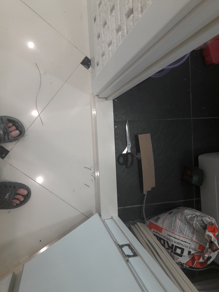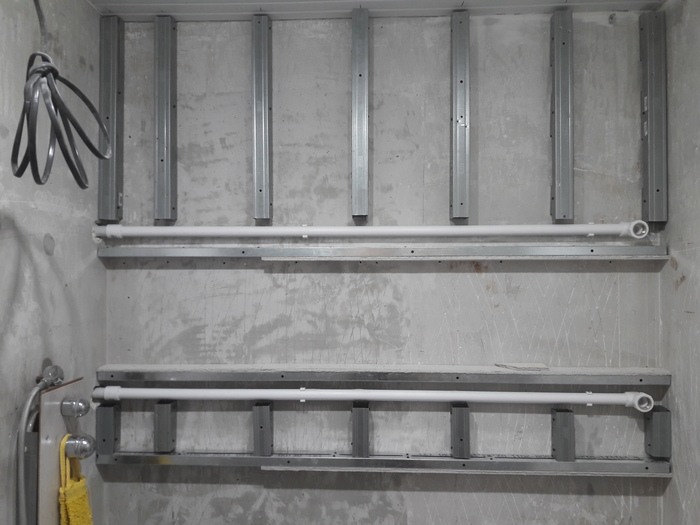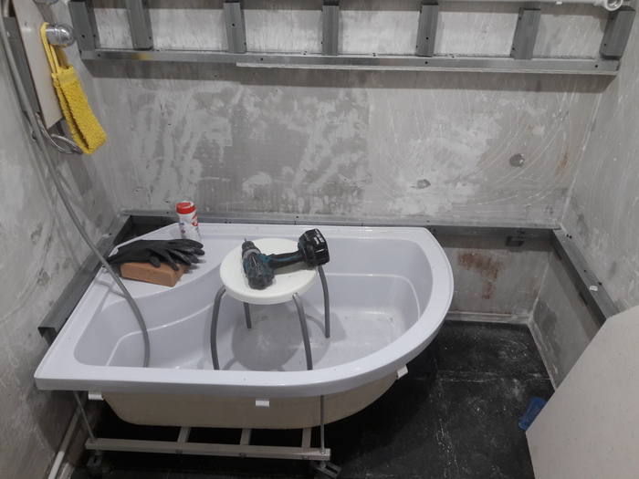Набил профилей под стальную (не чугунную ванну). Это кроме ножек, т.к. читал что при браке ванны может продавиться метал и потрескаться эмаль в местах крепления ножек. А так ножки ванны частично разгрузятся.
